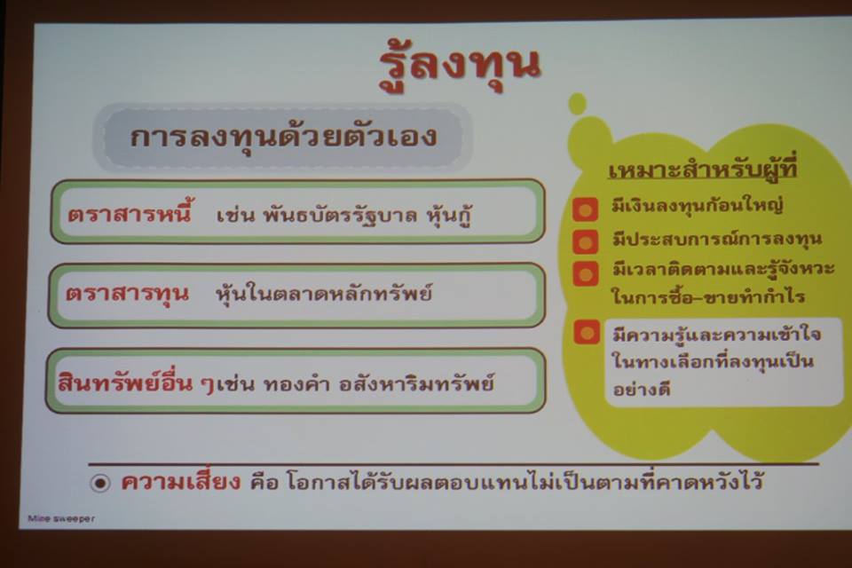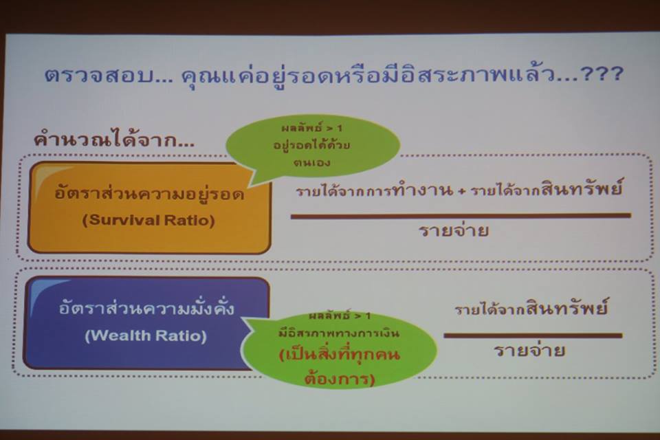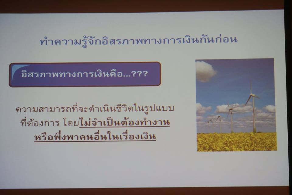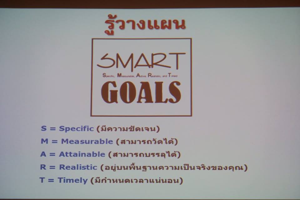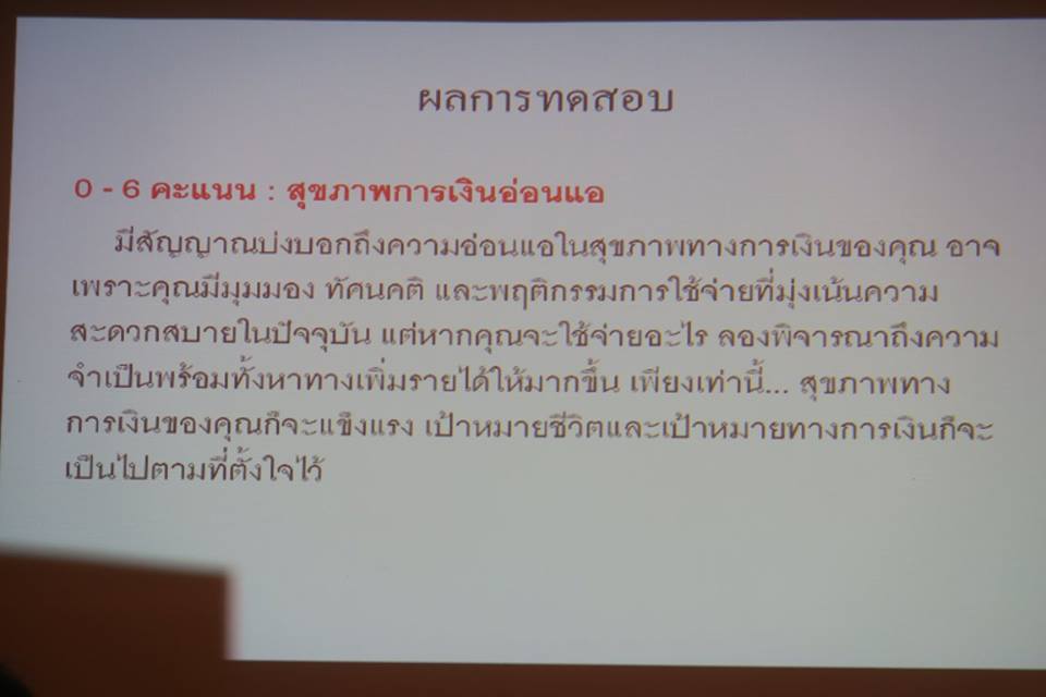 จากนั้นมีการเสนอ SMART GOALS แล้วทดสอบพิสัยทางการเงินการคลังกันด้วยแบบทดสอบ ๑๒ ช้อ ผลออกมา ๓ กลุ่ม คือ อ่อนแอ / ปานกลาง / ดีมาก ซึ่งทั้งหมดเกือบ ๓๐ คน อยู่ในเกณฑ์ดีมากไม่กี่คน จากนั้นจึงต่อด้วยรู้ออม รู้ใช้จ่าย รู้ลงทุน จนจบวันด้วยการทดลองออกแบบกับ ๒ กรณีนำร่อง น้องใหม่มาเริ่มงานอายุ ๒๔ ที่คาดหวังว่าจะอยู่ถึง ๘๐ ปี แต่แผ่นการออมและใช้สามารถสำรองใช้ได้เพียง ๗๒ ปีหมด กับอีกคู่สมรสวัย ๔๐ ที่คาดว่าจะอยู่ถึง ๘๐ ปรับแผนไปมาลงเอยที่ตายแล้วยังเหลือเงินพินัยกรรม-ทำศพอีก ๑ ล้านบาท