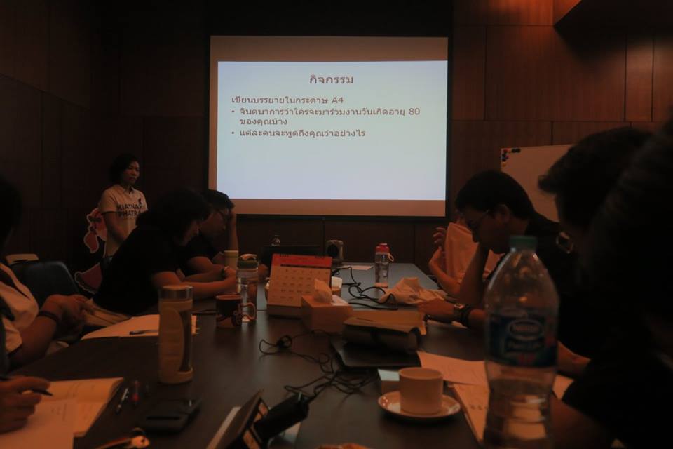 จากนั้นโยนโจทย์ให้แต่ละคนคิดของเองว่าหากจะอยู่ถึงเมื่อ ๘๐ ปี แล้วอยากให้วันนี้มีการฉลองอย่างไร ใครมาบ้าง แล้วเขาจะกล่าวถึงเราอย่าไร