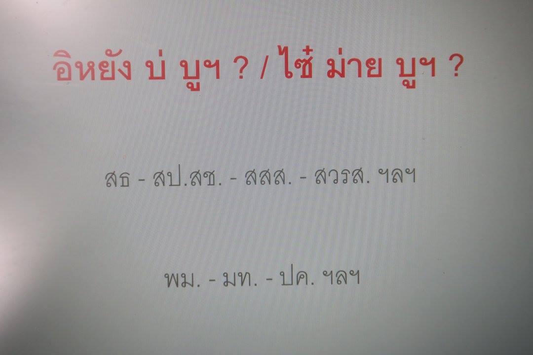 "อิหยัง ๆ ก็ฮื้อเฮาบูรณาการกันในหมู่บ้าน แต่หมู่หมอกันเองบ่อเคยบูกันเองเลย เดี๋ยว สสส.เดี๋ยว สช. เดี๋ยว สปรส. เดี๋ยว สธ อสม. แถม พช. พอช. ฮู๊ย พวกเฮาบูกันจนบ่ฮู้จะบูจังได้แล้วเน่อ !!! "