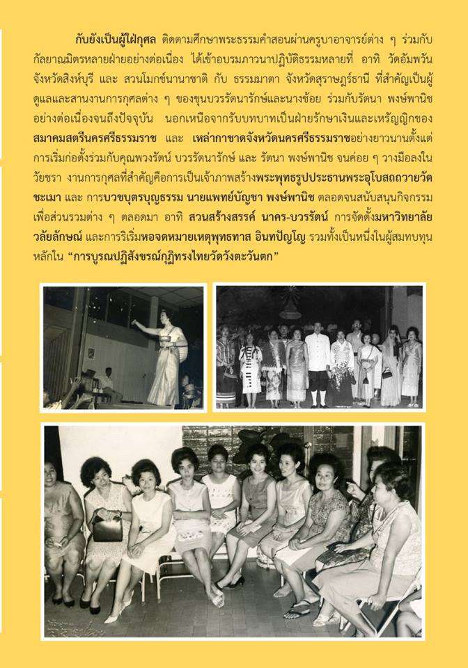 กับยังเป็นผู้ใฝ่กุศล ติดตามศึกษาพระธรรมคำสอนผ่านครูบาอาจารย์ต่าง ๆ ร่วมกับกัลยาณมิตรหลายฝ่ายอย่างต่อเนื่อง ได้เข้าอบรมภาวนาปฏิบัติธรรมหลายที่ อาทิ วัดอัมพวัน จังหวัดสิงห์บุรี และ สวนโมกข์นานาชาติ กับ ธรรมมาตา จังหวัดสุราษฎร์ธานี ที่สำคัญเป็นผู้ดูแลและสานงานการกุศลต่าง ๆ ของขุนบวรรัตนารักษ์และนางช้อย ร่วมกับรัตนา พงษ์พานิชอย่างต่อเนื่องจนถึงปัจจุบัน นอกเหนือจากรับบทบาทเป็นฝ่ายรักษาเงินและเหรัญญิกของสมาคมสตรีนครศรีธรรมราช และ เหล่ากาชาดจังหวัดนครศรีธรรมราชอย่างยาวนานตั้งแต่การเริ่มก่อตั้งร่วมกับคุณพวงรัตน์ บวรรัตนารักษ์ และ รัตนา พงษ์พานิช จนค่อย ๆ วางมือลงในวัยชรา งานการกุศลที่สำคัญคือการเป็นเจ้าภาพสร้าง “พระพุทธรูปประธานพระอุโบสถถวายวัดชะเมา” และ การ “บวชบุตรบุญธรรม นายแพทย์บัญชา พงษ์พานิช” ตลอดจนสนับสนุนกิจกรรมเพื่อส่วนรวมต่าง ๆ ตลอดมา อาทิ สวนสร้างสรรค์ นาคร-บวรรัตน์ การจัดตั้งมหาวิทยาลัยวลัยลักษณ์ และการริเริ่มหอจดหมายเหตุพุทธทาส อินทปัญโญ รวมทั้งเป็นหนึ่งในผู้สมทบทุนหลักใน “การบูรณปฏิสังขรณ์กุฏิทรงไทยวัดวังตะวันตก”