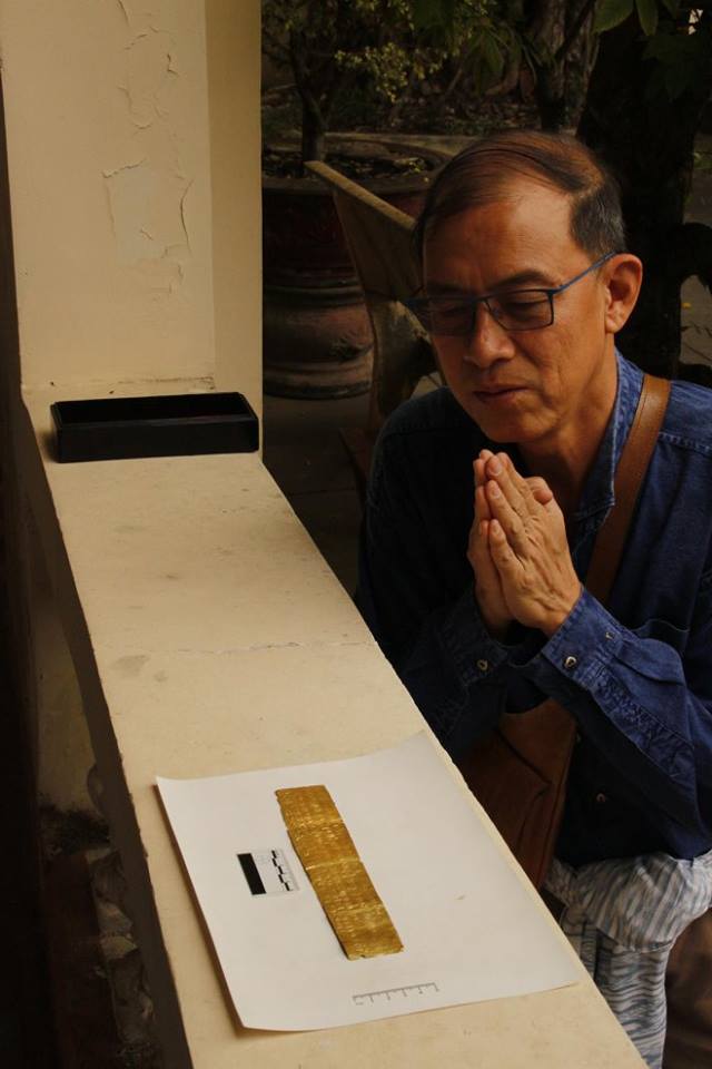 หนึ่งในบรมครูพระพุทธศาสนาและอักขระโบราณของโลก ก็ส่งภาพนี้มาตะกี้นี้ พร้อมคำที่จั่วหัวภาษาอังกฤษ จากการที่ได้ร่วมทางไปกับท่านเมื่อปลายปี ๕๘ แล้ว ผอ.พิพิธภัณฑ์เปิดคลังรักษาพระสุพรรณบัฏจารึกพระคาถาหัวใจในพระพุทธศาสนา คือ "เยธัมมาฯ" ที่ถือว่าคือ "อิทัปปัจจยตาปฏิจจสมุปบาท" อย่างย่อ สมัยโบราณกว่าพันปีที่ขุดพบแถบปากแม่น้ำโขง ให้พวกเราได้ศึกษา แล้วผมก็อดไม่ได้ที่จะนมัสการอย่างยิ่ง ๆ สักครั้ง โดยไม่รู้หรอกว่าถูก อ.จับภาพนี้ไว้ แล้วเพิ่งส่งมาให้