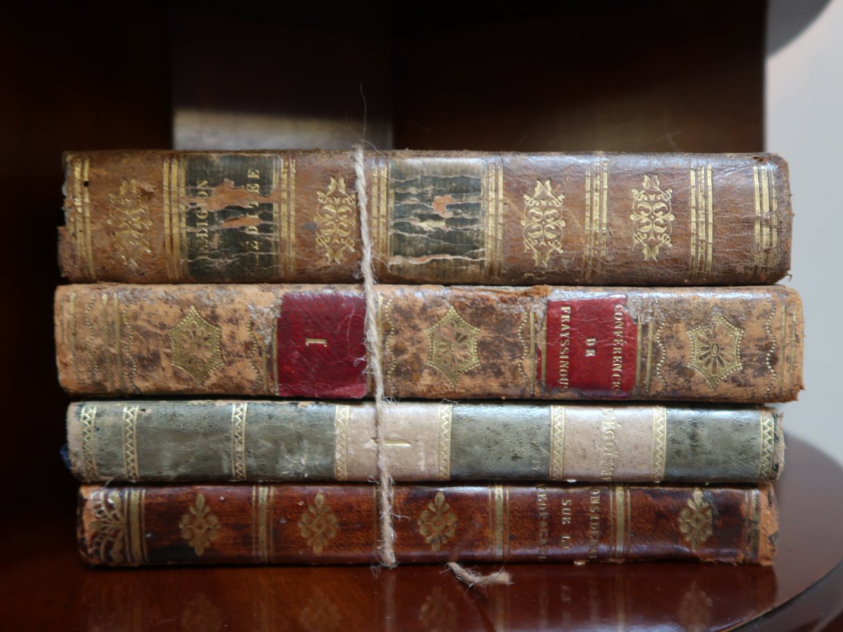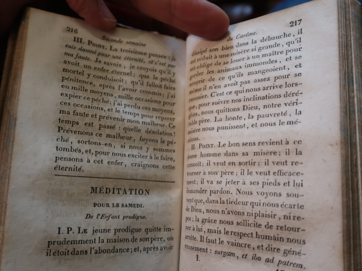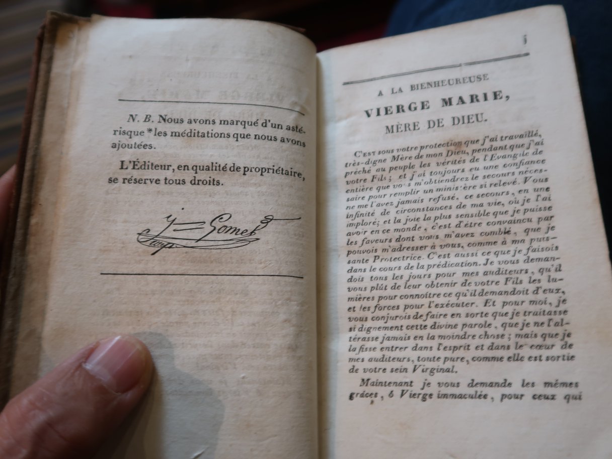(bunchar.com บัญชาชีวิต 20180503_1) โรงแรมที่พักนี้ โฆษณาว่ามีห้องสมุดด้วย หลังอาหารเช้าวานนี้ จึงถามหาว่าอยู่ไหน เจอเป็นชั้นนิดเดียวนี้ พร้อมกับคำออกตัวว่า หาใช่ห้องสมุดไม่ เป็นเพียงชั้นโชว์เท่านั้น ที่ชั้นบนสุด เจอหนังเล่มนี้ที่ข้องใจไม่น้อย ชื่อ Meditation Sur Les Evangiles น่าจะภาษาฝรั่งเศส ? พลิก ๆ ดู เป็นของระคริสตศาสนา พิมพ์เมื่อปี ๑๘๓๖ ก็ พ.ศ.๒๓๗๙ หรือกลางรัชกาลที่ ๔ โน่น การค้นคว้าพระพุทธศาสนาของชาวยุโรปเพิ่งเริ่มในสมัยรัชกาลที่ ๕ แต่ว่าทำไมในนี้มีบทหนึ่ง ใช้คำว่า SAMEDI ด้วย ? ใครรู้ กรุณาไขให้ด้วยครับ