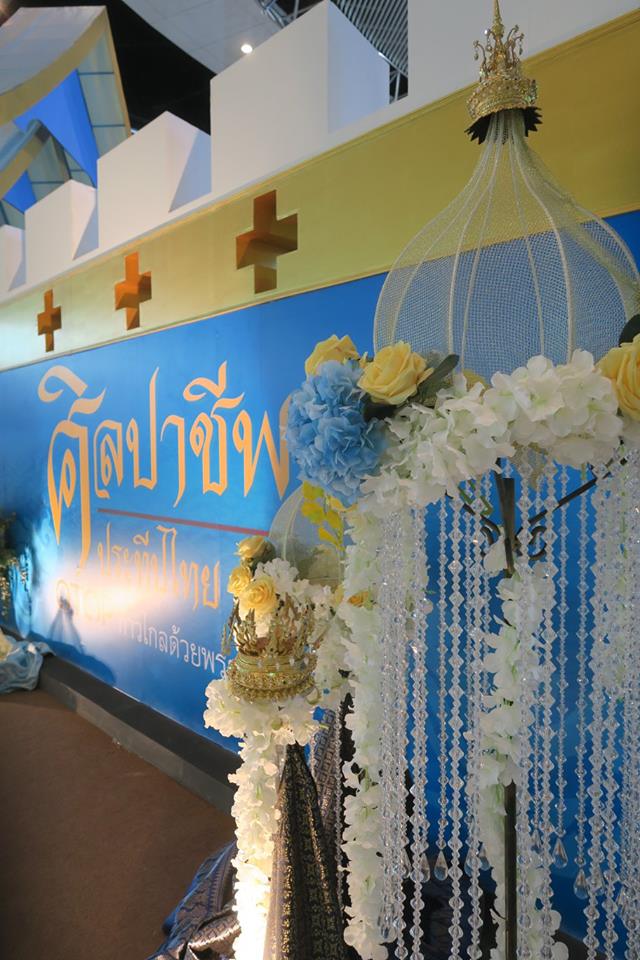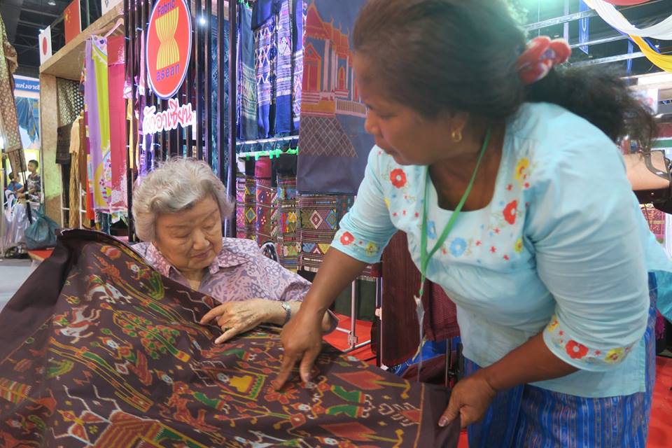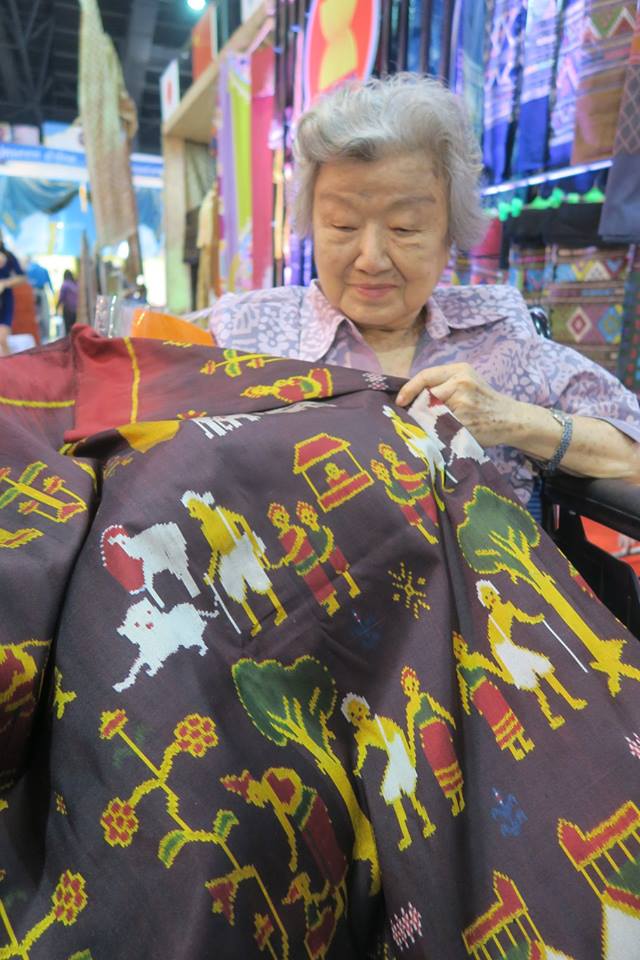 ก่อนกลับ ตรงนิทรรศการเครื่องแต่งกายอาเซียน + ๓ เจอสองสาวชาวร้อยเอ็ดสุวรรณภูมิ มีผ้าพะเหวดมัดหมี่ทอเอง เอามาประกวด ๒ ผืน ผืนหนึ่งได้รางวัลชมว่าเชยมา ๔๐,๐๐๐ บาท จึงให้คลี่อธิบายให้น้าพาดู ผืนแรกมีชูชกกัณฑ์เดียว อีกผืนมี ๕ กัณฑ์ จึงเอามา เผื่อจะได้ใช้งานบุญในเบื้องหน้า