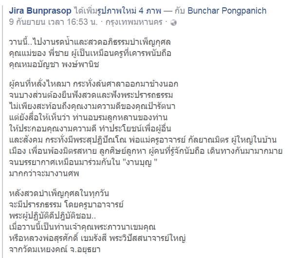 พระอาจารย์สุรศักดิ์จากวัดมเหยงคณ์ อยุธยา ที่เป็นอีกสำนักภาวนาสำคัญ เมตตารับนิมนต์แบบทันควัน นั่งรถติดมาจากอยุธยา ๔-๕ ชั่วโมง แล้วแสดงธรรมจับใจมาก ๆ วันหลังจะย่อยให้แม่อีกครั้งนะครับ วันนี้อ่านที่ตู่ จิรา มือดีของทีวีบูรพาแห่งฅนค้นฅน เขียนบอกเพื่อน ๆ พลาง ๆ ก่อนนะครับ เธอว่า เหมือนมาร่วมกันใน "งานบุญ " มากกว่าจะมางานศพ.