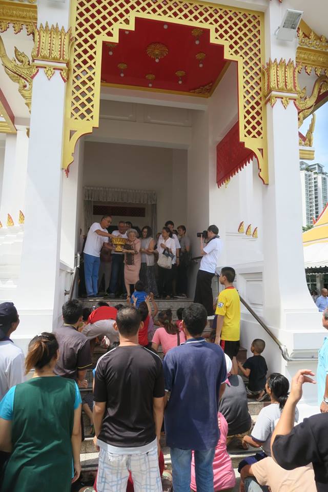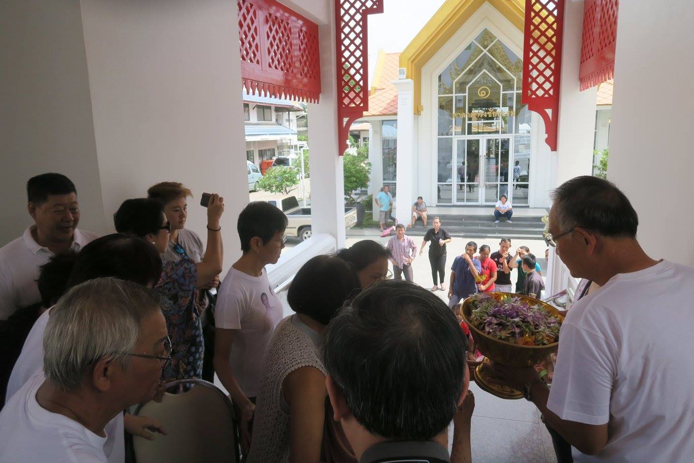 หลังอาบรดแม่ด้วยน้ำหอม 4711 ที่แม่ชอบจนครบคน พระทั้ง ๕ รูปก็บังสกุลอุทิศแด่แม่ จบด้วยการโปรยทานที่เต้ยรีบถ่ายรูปจากข้างบนแล้วลงไปถ่ายข้างล่างเผื่อได้ลูกกำพริกบ้าง งานนี้สู้มืออาชีพรับทานที่วัดไม่ได้ หรือไม่ก็น้าพากับพี่ ๆ ตั้งใจโปรยให้คนอื่น จึงไกลไม่ถึงที่เต้ยยืน ได้มาห่อเดียวเองครับ พอกลับขึ้นไปที่แม่ จึงขอเหรียญบาทกับสลึงมาอย่างละ ๑ นะครับ