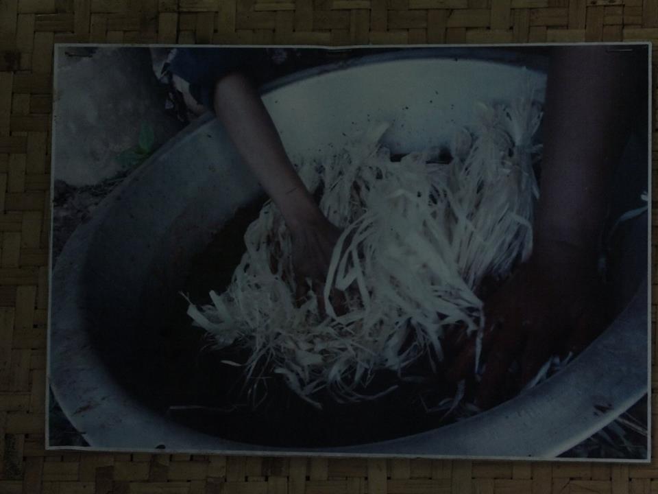 ที่ภูฟ้า มีภาพแสดงให้เห็นขั้นตอนตั้งแต่ตัดเถามาเป็นท่อน ๆ แล้วแยกใยบนเปลือกมาผึ่งแห้งแล้วต้มย้อมกับนานาสิ่งให้สีจากธรรมชาติ