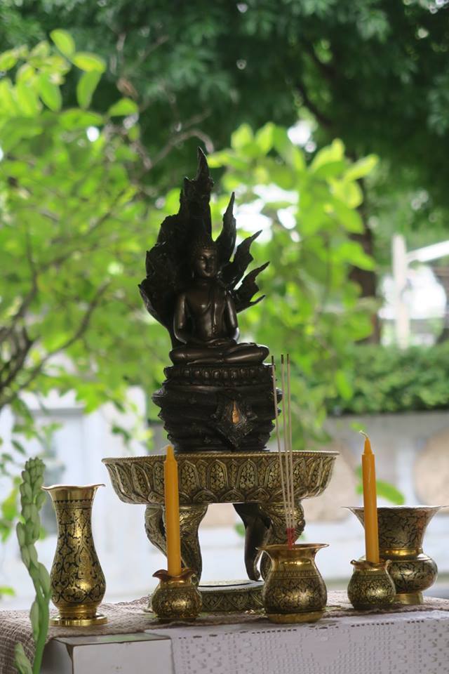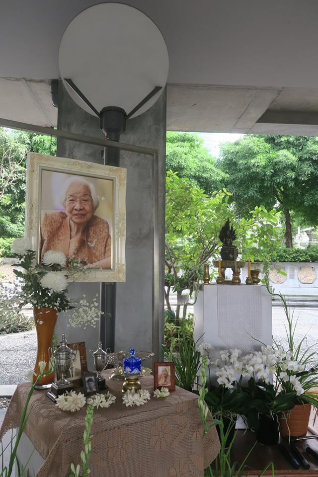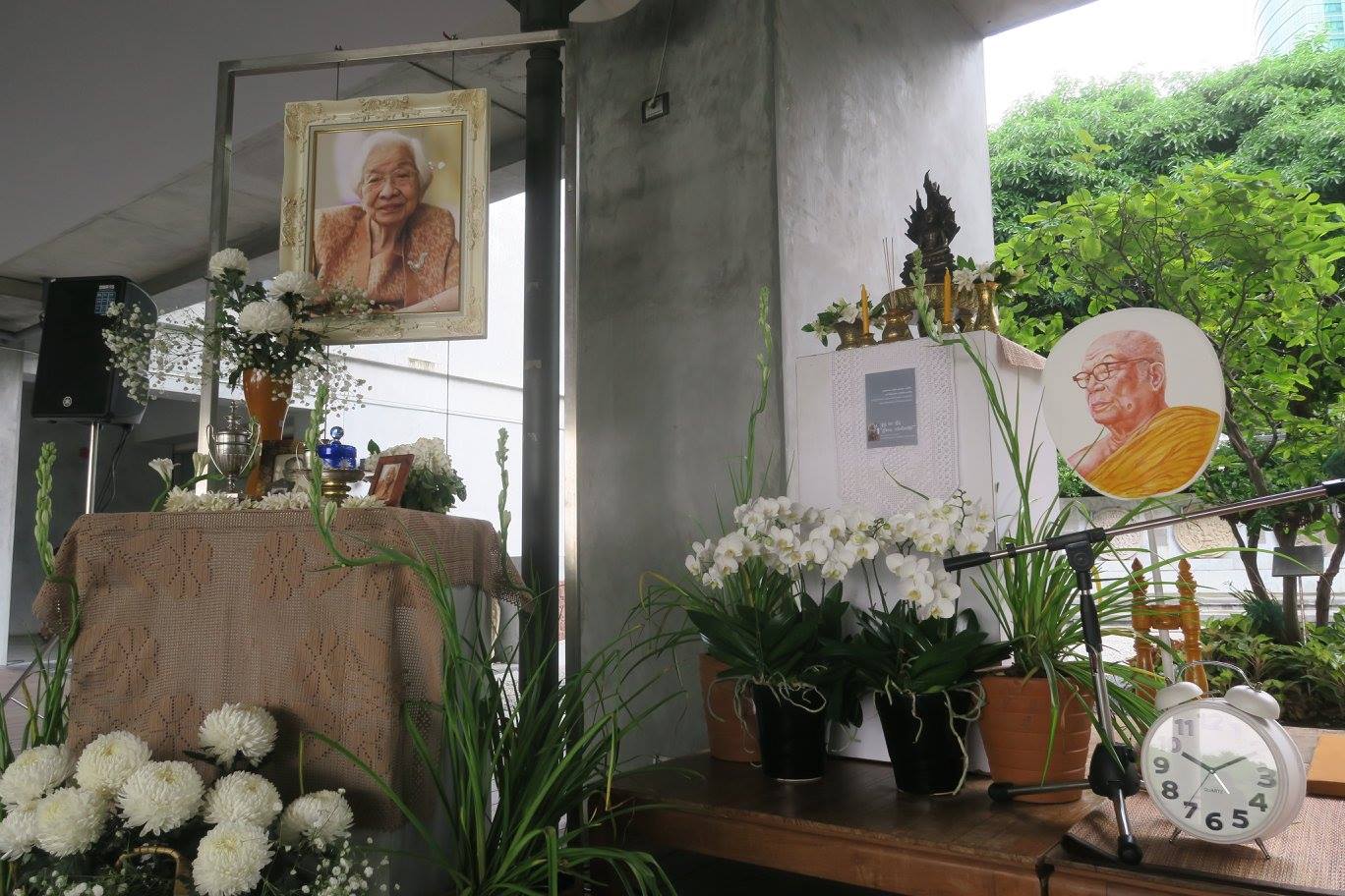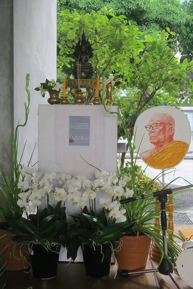 งานนี้ เราทำกันง่าย ๆ ด้วยการเชิญพระนาคปรกองค์ที่ทำถวายพระเทพและแม่ให้เต้ยหามาไว้เป็นพระประจำวันเกิดของแม่ แล้วก็เอาเครื่องถมนครของแม่และน้าพามาเป็นเชิงเทียน กระถางธูปและเจกัน เช่นเดียวกับที่โกศอัฐิของพ่อแม่และพี่เติบ โดยโกศแก้วของแม่นั้นวางไว้บนพานถมทองที่เต้ยหามาเก็บไว้นานแล้ว ในขณะที่ดอกไม้นั้น พี่หงิดหามาทั้งดอกพุดและเบญจมาศกับยิปโซ มีมาลัยปีบที่ติ่งกะรุ่งร้อยมาจากบ้าน แล้วก็ซ่อนกลิ่นซ้อนกับฟาแลนที่ทางสวนโมกข์กับคุณประยูรจัดไว้ โดยได้เอาผ้าถักโครเชต์ฝีมือแม่มาปูรองด้วยครับ