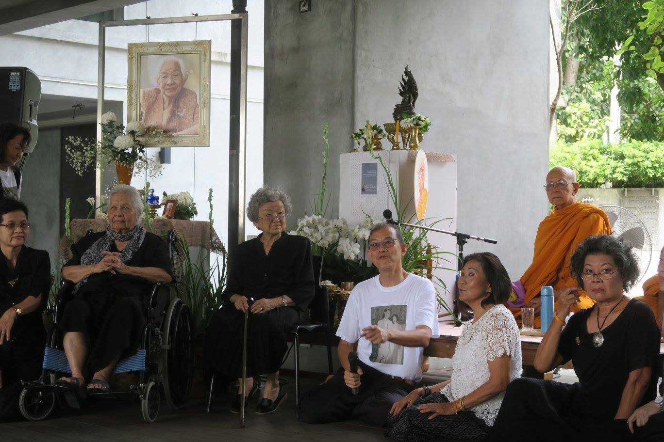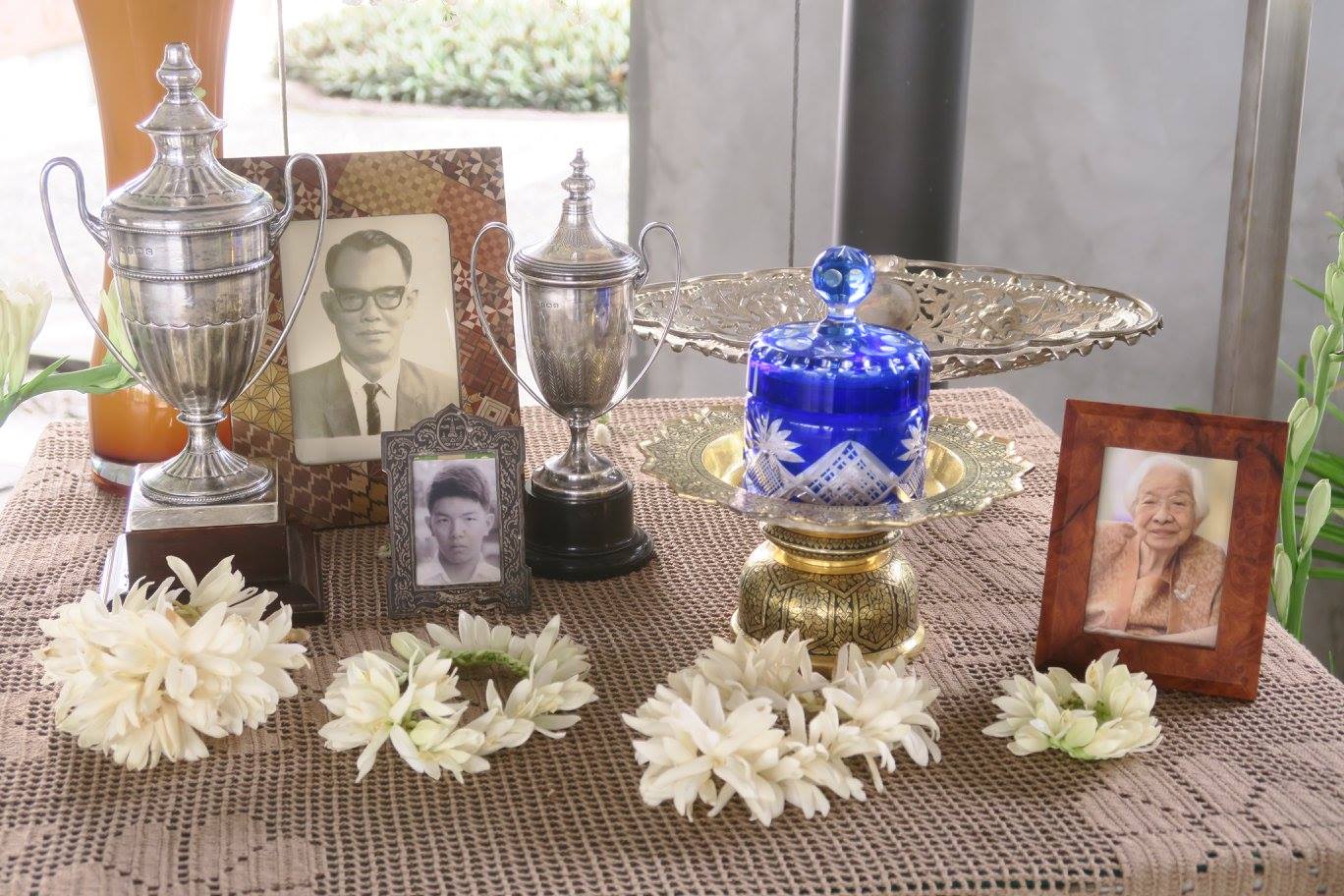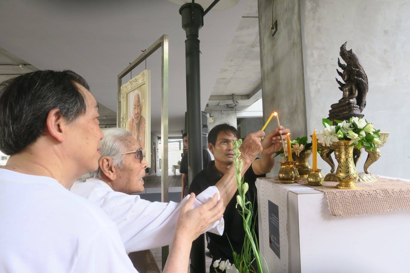 งานนี้ เราทำกันง่าย ๆ ด้วยการเชิญพระนาคปรกองค์ที่ทำถวายพระเทพและแม่ให้เต้ยหามาไว้เป็นพระประจำวันเกิดของแม่ แล้วก็เอาเครื่องถมนครของแม่และน้าพามาเป็นเชิงเทียน กระถางธูปและเจกัน เช่นเดียวกับที่โกศอัฐิของพ่อแม่และพี่เติบ โดยโกศแก้วของแม่นั้นวางไว้บนพานถมทองที่เต้ยหามาเก็บไว้นานแล้ว ในขณะที่ดอกไม้นั้น พี่หงิดหามาทั้งดอกพุดและเบญจมาศกับยิปโซ มีมาลัยปีบที่ติ่งกะรุ่งร้อยมาจากบ้าน แล้วก็ซ่อนกลิ่นซ้อนกับฟาแลนที่ทางสวนโมกข์กับคุณประยูรจัดไว้ โดยได้เอาผ้าถักโครเชต์ฝีมือแม่มาปูรองด้วยครับ