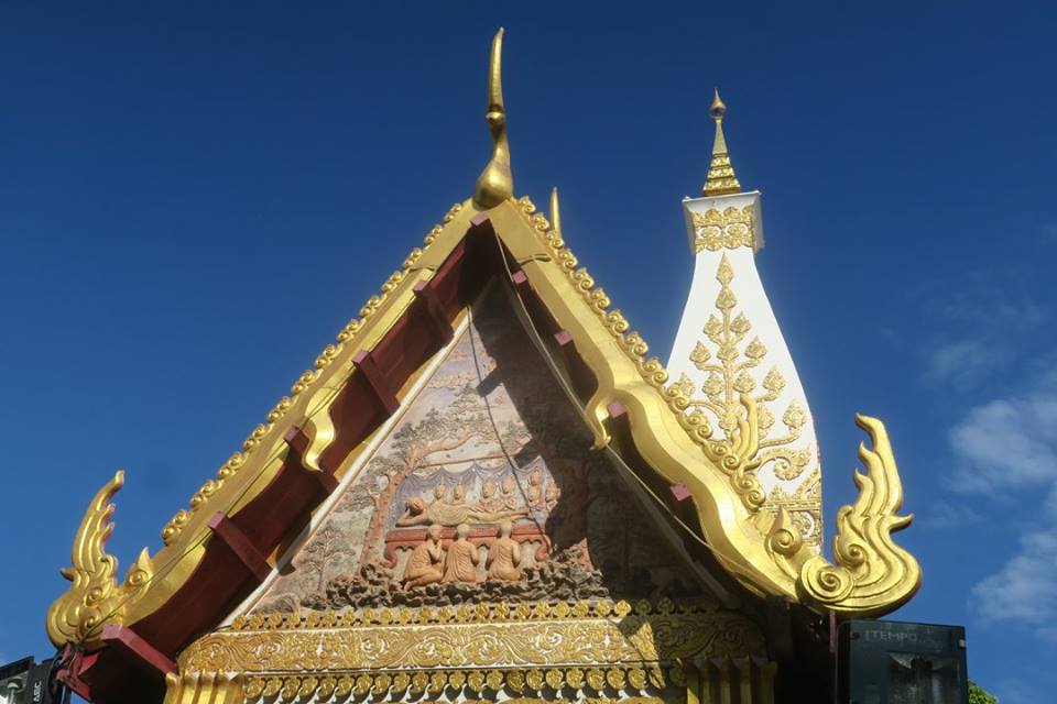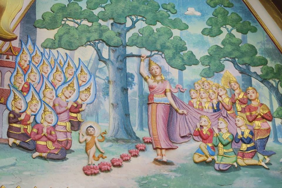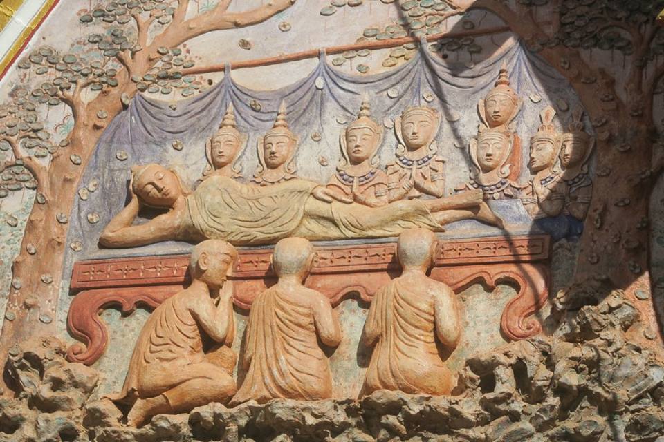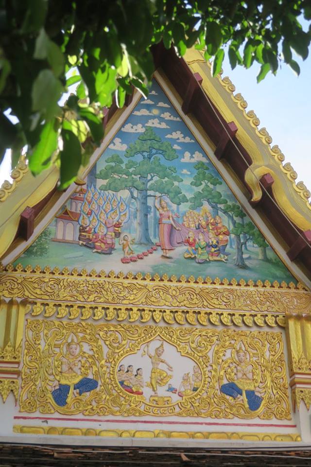 ภาพ ปูนปั้นหน้าบันซุ้มประตูวิหารคดวัดพระธาตุพนมวรมหาวิหาร ปางประสูติ ปราบองคุลีมาล และ มหาปรินิพพาน