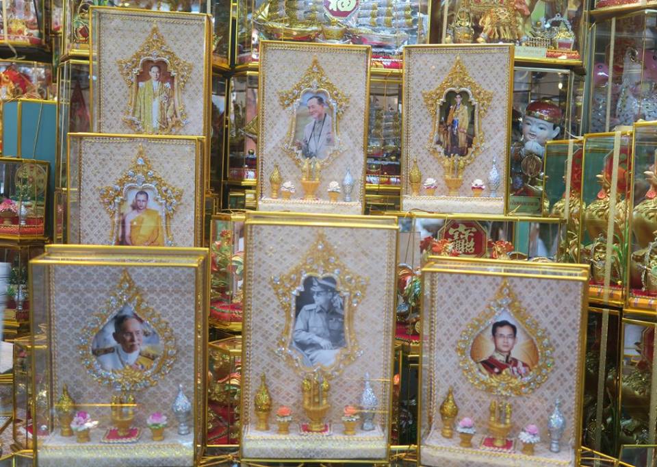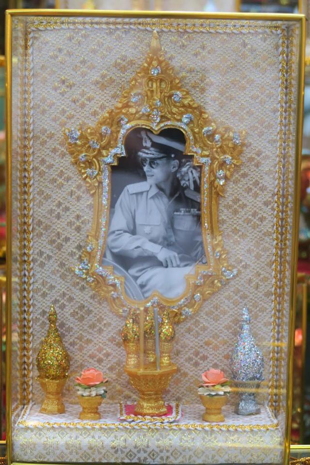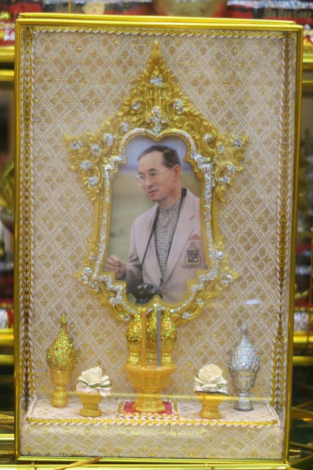 ภาพ ตู้พระฉายาลักษณ์พระเจ้าอยู่หัวพร้อมเครื่องทองน้อยถวายขนาดกระทัดรัดบนแผงที่ตลาดนัดจตุจักร ซึ่งร้านหนึ่งริเริ่มทำขึ้นเองเมื่อครบหนึ่งเดือนที่พระเจ้าอยู่หัวสวรรคต