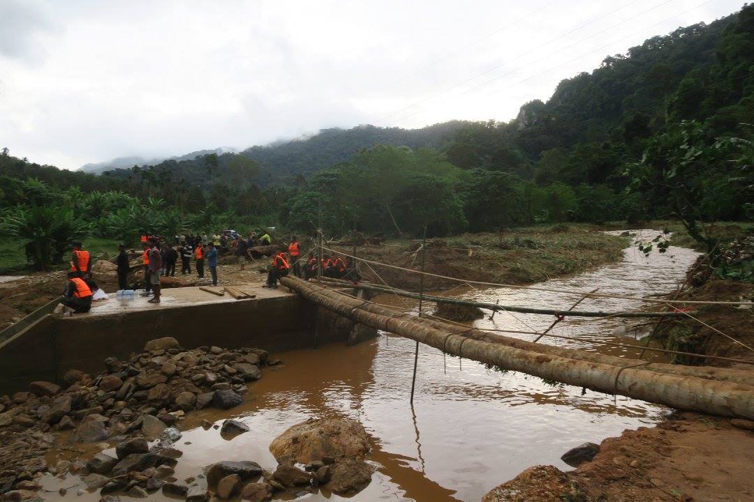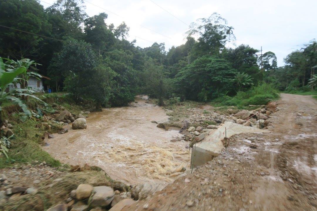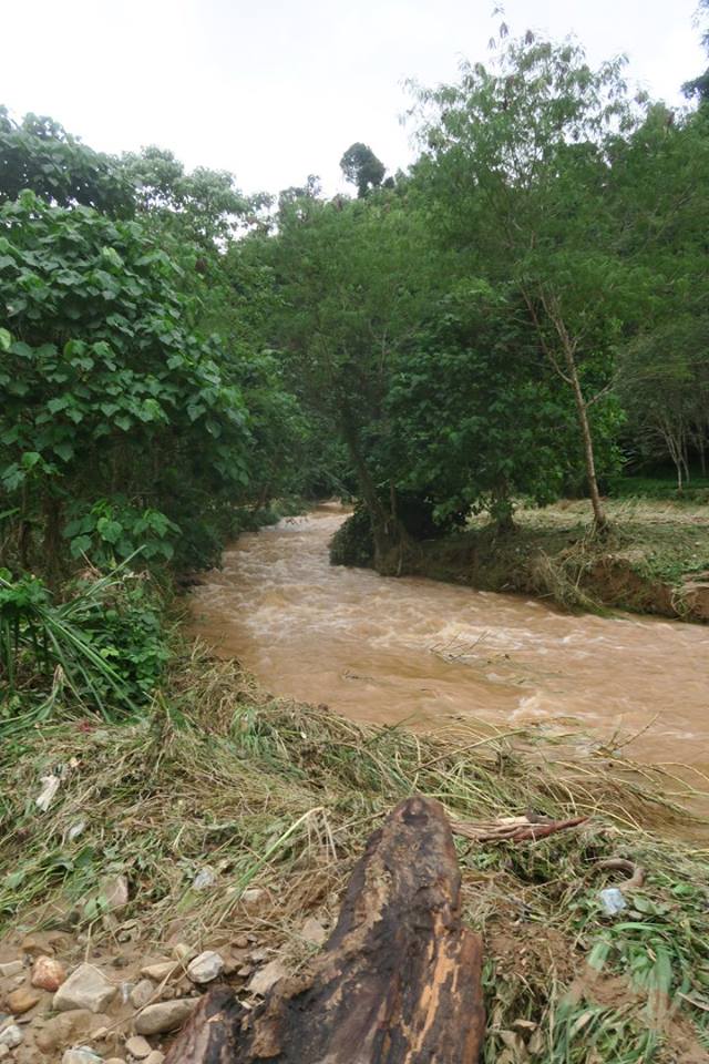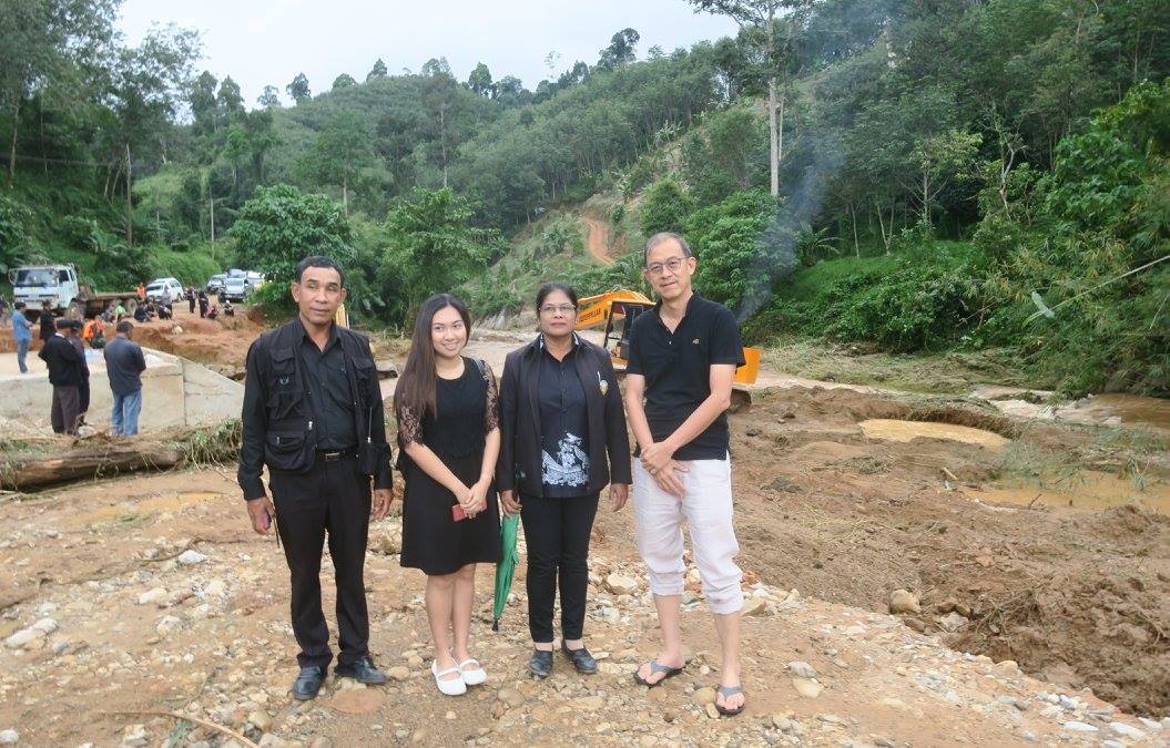 ตลอดทางยังมีร่องและรอยน้ำป่าหลากท่วมท้นล้นทะลักทำลายทั้งถนนและเรือกสวนที่ล้วนเป็นทุเรียนชั้นดีที่กำลังรุ่งเรือง ที่คลองแรดที่สะพานขาดสะกัดพระให้พักที่โรงเหล็กอยู่ ๒ คืนนั้น ชาวบ้านได้ทอดมะพร้าวสองต้นให้พระท่านผ่านเมื่อเช้านี้ จึงได้พบนายกแดงกับรองที่รอนำผมมาจาก อบต.กรุงชิง กำลังกำกับการซ่อมทางพร้อมกับคณะทหารและไทยรัฐทีวีที่มาถึงที่แล้ว