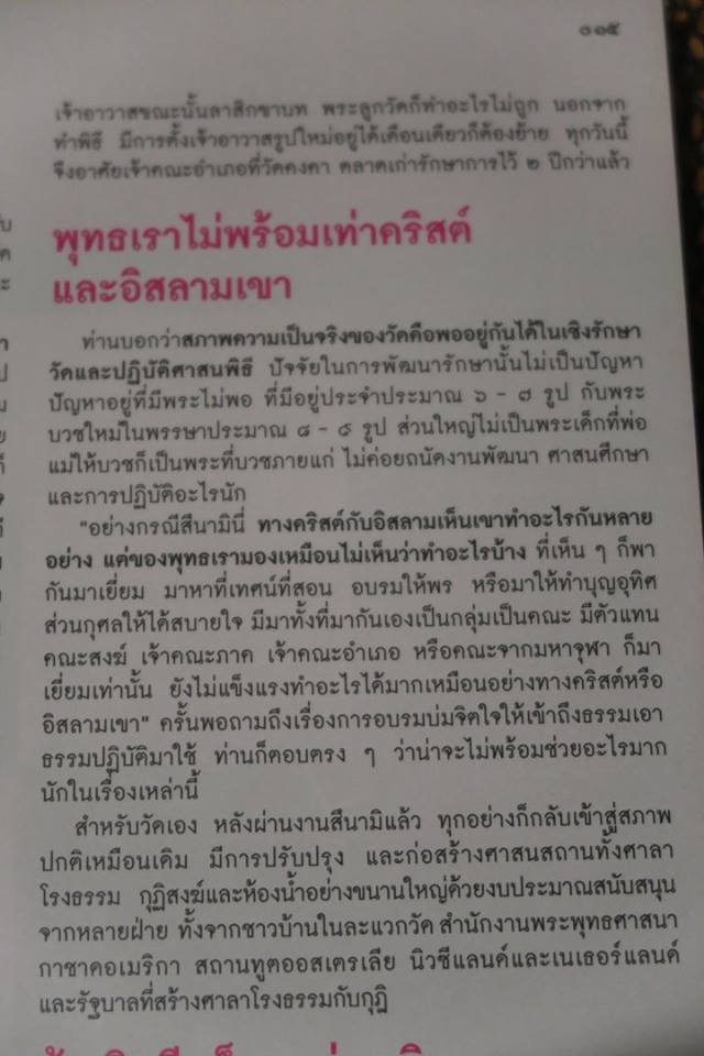 - มีมาทั้งที่มากันเองเป็นกลุ่มเป็นคณะ มีตัวแทนคณะสงฆ์ เจ้าคณะภาค เจ้าคณะอำเภอ หรือคณะจากมหาจุฬาฯ ก็มาเยี่ยมเท่านั้น ยังไม่แข็งแรงทำอะไรได้มากเหมือนอย่างทางคริสต์หรือิสลามเขา