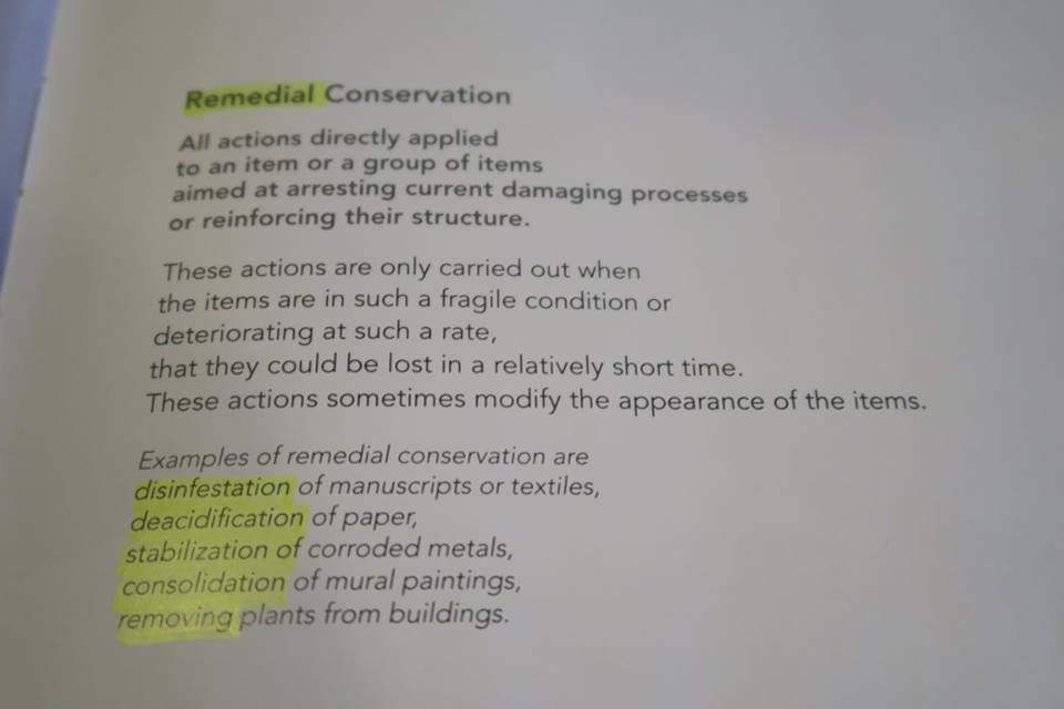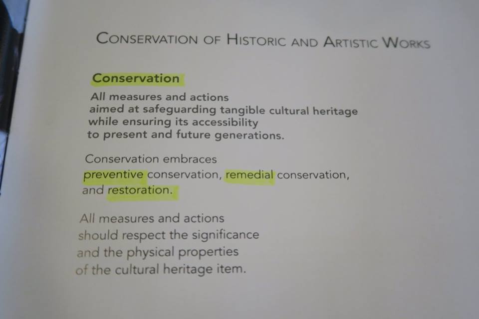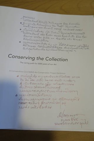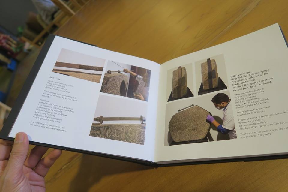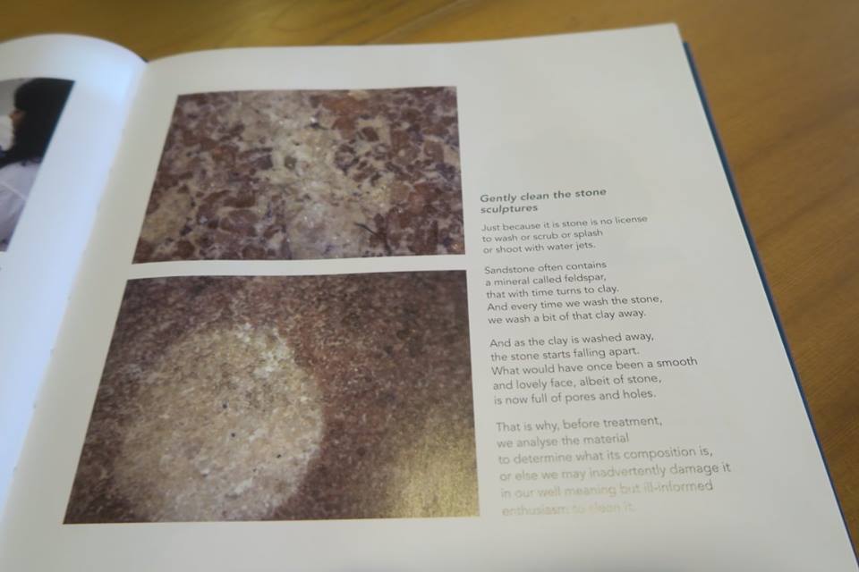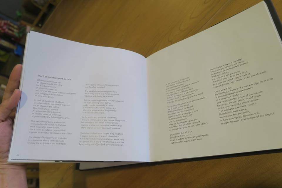 ลองไล่ดูเองนะครับ มีภาพจารึกพระเจ้าอโศก ภาพชมพูทวีป ประติมากรรมหินทรายสีชมพูที่ระบุว่า "ห้ามล้าง" สนิมสารพัดที่แต่ละแบบต้องทำแต่ละวิธี กระทั่งผ้าด้ายที่เหลือเชื่อในการถนอมรักษาที่เขาแบ่งเป็น ๓ กระบวน คือ ปกป้อง - บำบัด และ ซ่อมเสริม ที่อยู่ใน ๓ ภาพท้ายสุด