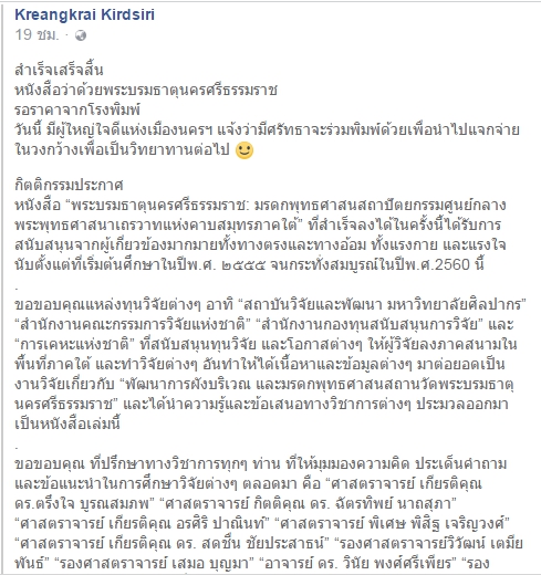 ผมเสนอ กก.สุธีรัตนามูลนิธิ และ บวรนคร ว่าหนังสือนี้ เราน่าจะพิมพ์แจกให้ได้อ่านกันทั้งเมืองนคร สานงานที่เมื่อพระราชทานเพลิงศพคุณตาขุนบวรฯ ก็ได้พิมพ์งานของพี่ประทุม ชุ่มเพ็งพันธ์ออกมา แถมยังได้ทำเรื่องเรียนรู้บูชาพระบรมธาตุนคร กับการเรียนรู้รอยธรรมที่พระธาตุมาด้วยแล้ว