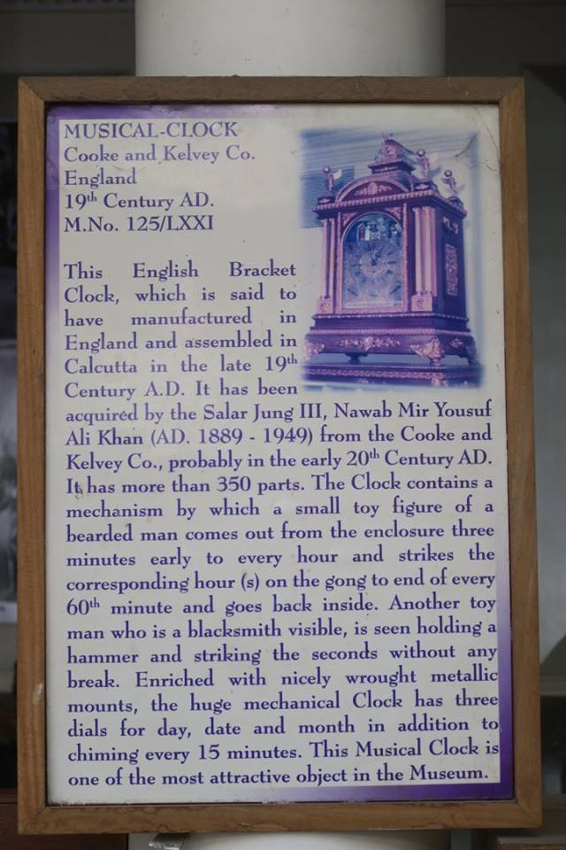 นอกนั้น ยังมีนาฬิกาเรือนหนึ่งที่มีคนมานั่งมุงดูเวลาตีที่ทำเป็นคนตีอยู่ในเรือน ระบุว่าทำมาจากอังกฤษ ประกอบที่โกลกัตต้า