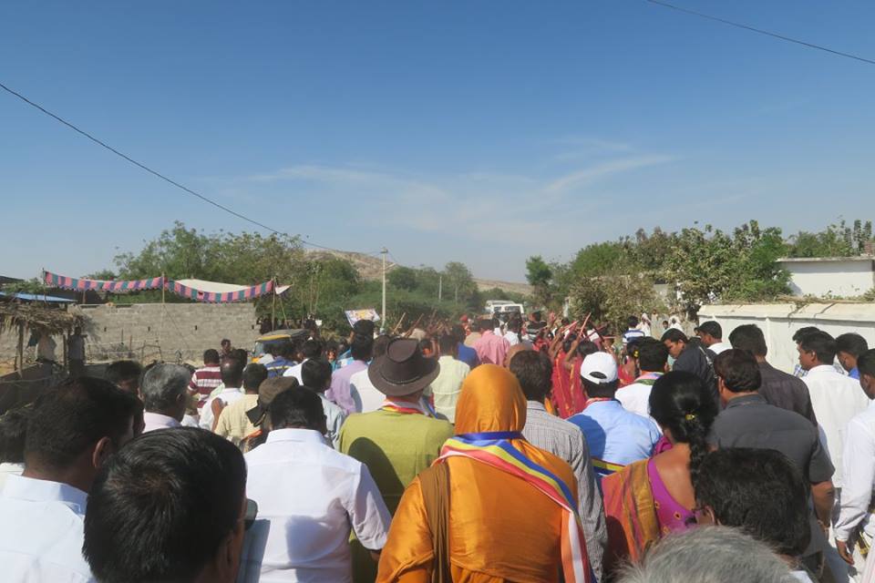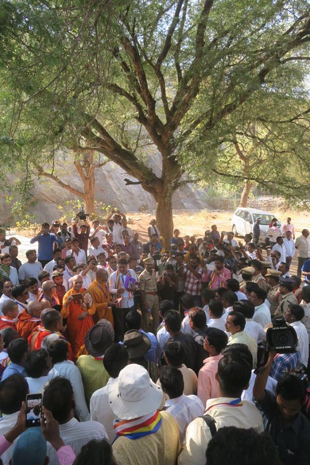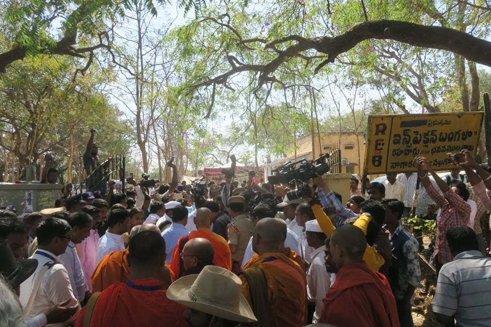 เราไปถึงเอาเมื่อราวบ่ายสองหรือบ่ายสาม เจอฝูงคนมารอรับเพื่อทำข่าวกันอย่างที่เห็นในภาพ เพราะงานนี้มิใช่เพียงการลงพื้นที่เืพื่อเรียนรู้เท่านั้น แต่รัฐบาลท้องถิ่นถือเป็นจังหวะประกาศแถลงข่าวการพัฒนาครั้งใหญ่หลายร้อยล้านรูปีเพื่อพัฒนาที่นี่เป็นสถานที่ท่องเที่ยวในพระพุทธศาสนา ทั้งถนนหนทาง ที่พักแรมคืน รวมทั้งพิพิธภัณฑ์ ฯลฯ โดยมี ๒ บิ๊กของรัฐและพื้นที่มาต้อนรับและแถลงข่าวด้วยตนเอง นักข่าวแน่นเอี๊ยด ประชาชนพลเมือง หน้าม้าลิ่วล่อ รวมทั้งแขกมุงเต็มไปทั่วทุกหัวระแหงตั้งแต่รแกถึงที่ทุกคนสะบักสะบอมงอมพระรามกันมาในรถ แล้วถูกต้อนไปนั่งรอในสองห้องหน้าส้วมสุดวิเศษที่มี ๓ โถให้ใช้ร่วม