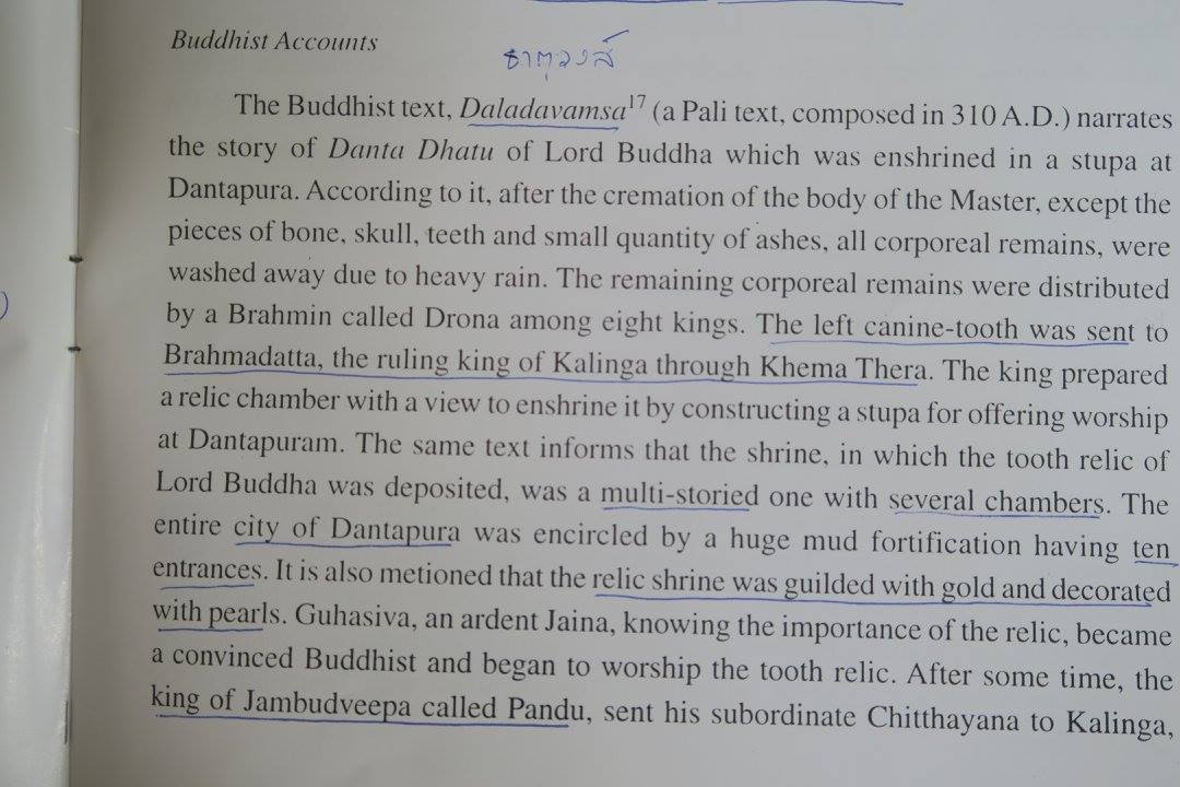 ในหนังสือเล่มนี้ที่สำนักโบราณคดีและพิพิธภัณฑ์แห่งรัฐบาลอานธรประเทศในนครไฮเดอราบัด เรียบเรียงและพิมพ์เมื่อปี พ.ศ.๒๕๔๕ ที่กำลังจะขุดค้นครั้งใหม่ซึ่ผมยังหาบันทึกรายงานไม่เจอ ระบุว่าแม้ทุกวันนี้ที่เป็นเพียงหมู่บ้านเล็ก ๆ นั้น ทันตะปุระ เคยเป็นนครหลวงของกลิงคะ หนึ่งใน ๑๖ มหาชนบททางชายฝั่งตะวันออก ที่สืบเนื่องมาจนถึงสมัยพระเจ้าอโศกมหาราช ในฐานะเมืองสำคัญทางการค้าทั้งภายในและภายนอกทางทะเล มีการตั้งถิ่นฐานเป็นเมืองที่รุ่งเรือง มีพุทธสถานและโบราณวัตถุสถานเก่าแก่ถึงสมัยพุทธกาลสอดคล้องกันในหลายบันทึกและพงศาวดาร ไม่ว่าจะทางลังกา ในชาดก มหาวัสดุ มหาวงศ์ มหาภารตะ จนกระทั่งพงศาวดารในศาสนาเชน