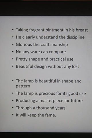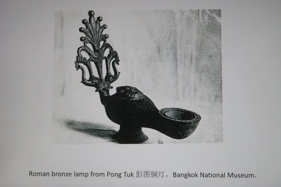 ศ.หลินบอกผมว่าที่รับมางานนี้เพราะติดใจในบทกวีโบราณของนายทัพนักกวีนามหยินจื้อ แห่งแคว้นเจี้ยวหยวนซึ่งอยู่แถวกว่างตุ้งในทุกวันนี้ เมื่อประมาณ ๑,๗๐๐ ปีก่อนโน้นว่าได้เห็นตะเกียงอย่างนั้นจากชาวโรมันที่นำมาถวายฮ่องเต้ แล้วเขียนพรรณนาไว้อย่างนี้ โดยที่เมืองจีนนั้นไม่เคยมีตะเกียงลักษณะนี้