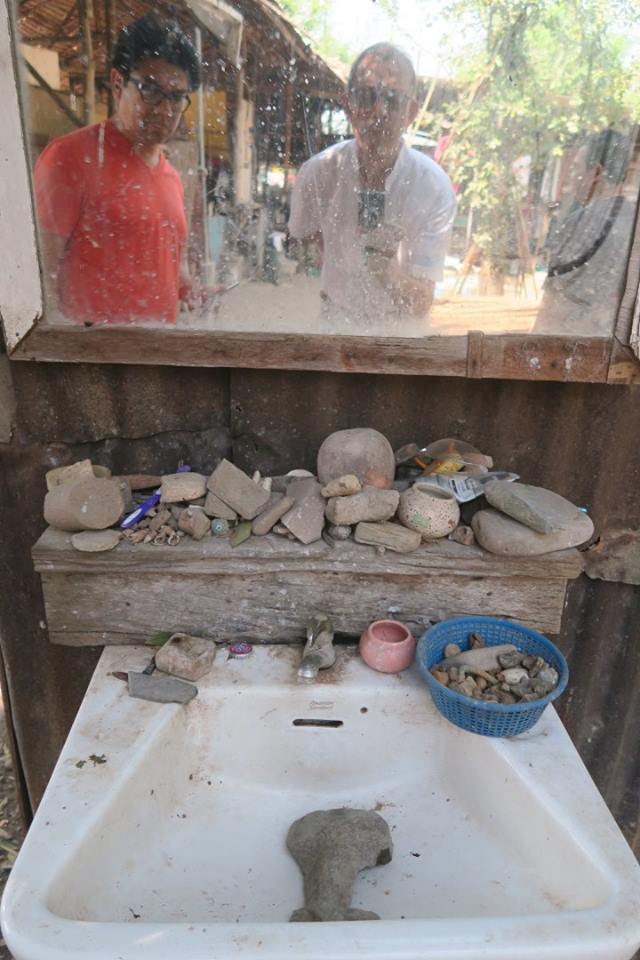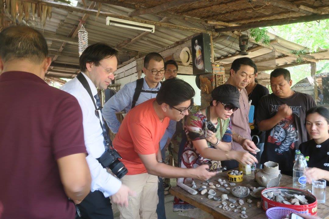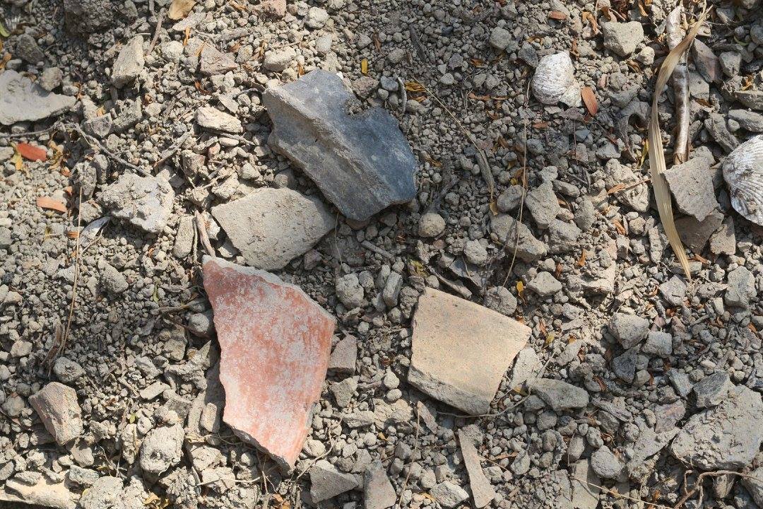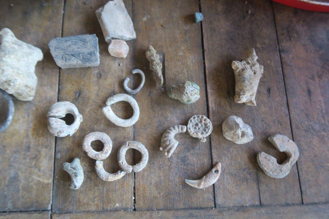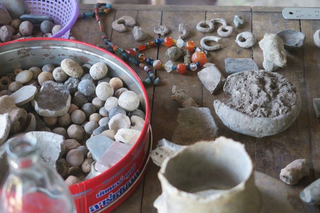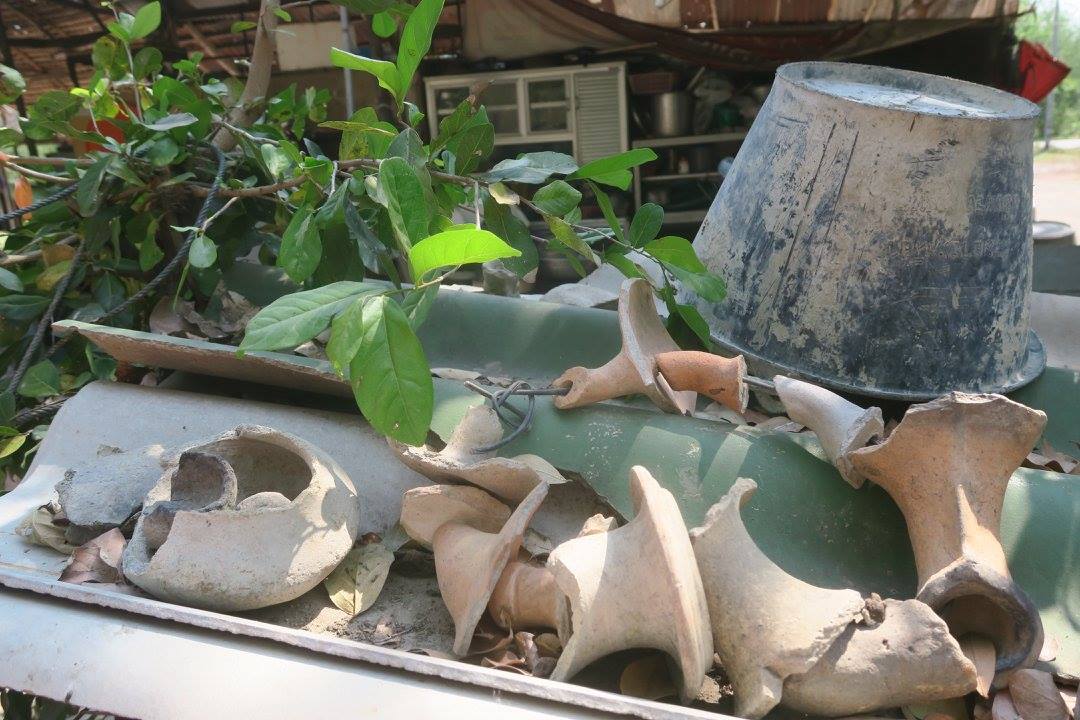 จากนั้นจึงผ่านไปที่ด้านหน้าวัดทางตอนเหนือนิดหนึ่ง เจอรอยการขุดหาสิ่งของกันขนาดนี้ แถมที่บ้านข้าง ๆ ก็มีข้าวของทั้งที่ทิ้งและเก็บกันไว้อย่างที่เห็น ทำเอาเหล่านักวิชาการโบราณคดีทั้งหลายแตกตื่นกับเศษภาชนะกระเบื้องทั้งหลายว่านี่นั่นนู่น จนกระทั่ว่าคล้าย NBPW เข้าด้วย ส่วนกุณฑีปากสั้นนั้นยิ่งน่าตกใจใหญ่ (หากผมฟังไม่ผิด) เพราะ ดร.อโลก บอกว่าแบบนี้เท่าที่รู้ มีการศึกษาว่าแต่โบราณใช้สำหรับล้างในห้องน้ำเข้าไปนั่น ในขณะที่หลายคนเสียดายแทน ดร.ลิน ที่กลับไปก่อน จึงไม่ได้เห็นอีกตะเกียงอย่างโรมันดวงเบ้อเริ่ม ส่วน อ.ปีเตอร์บอกว่า อยากไปให้ถึงสถานที่พบแผ่นงานช้างจารึก "อปรมาท" จึงพากันไปต่อที่อีกฟากของเมืองโบราณ