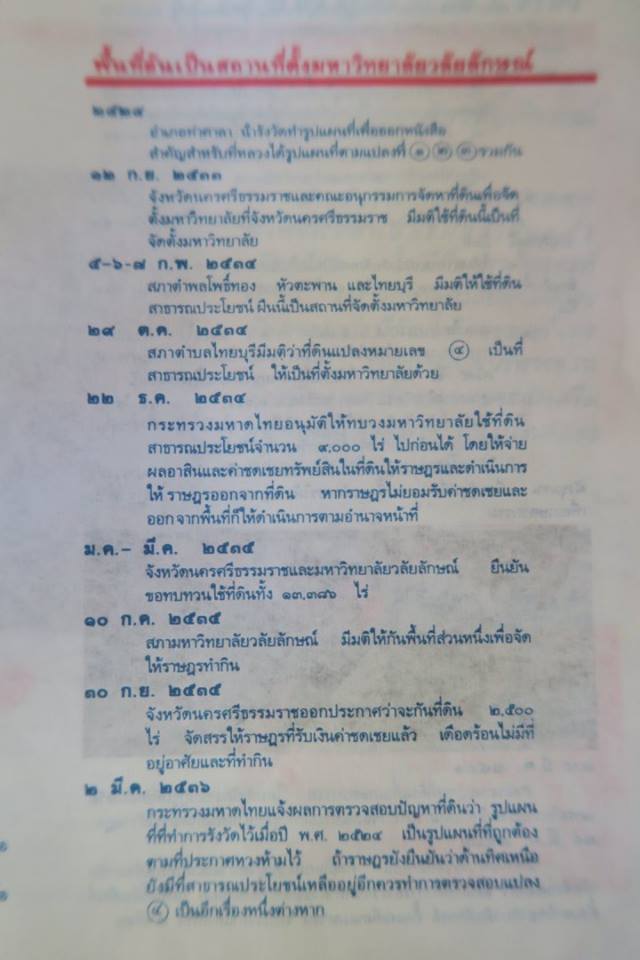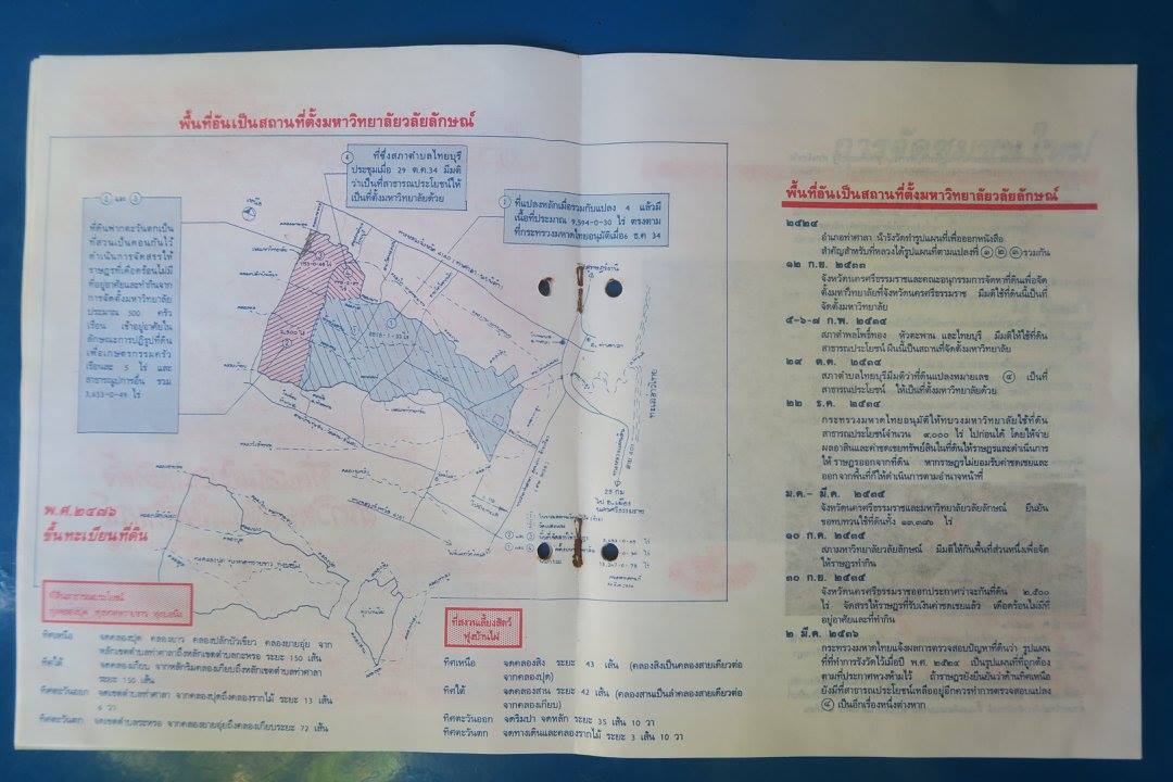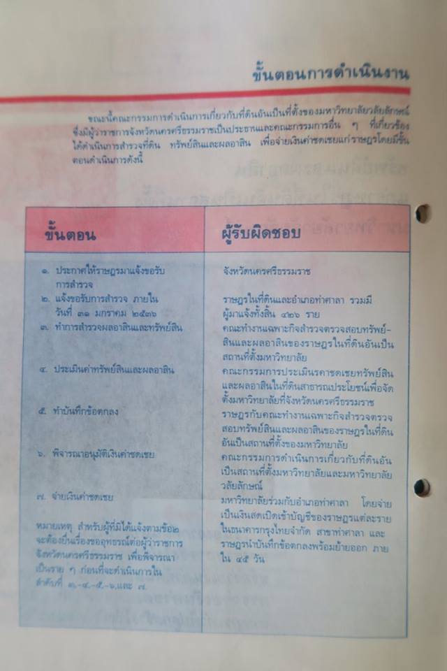 หนึ่ง การทำความชัดเจนเรื่องพื้นที่อันเป็นที่ตั้งว่าอยู่ตรงไหนและเป็นอย่างไรในแต่ละแปลงที่เอามาต่อกันจนเป็นพื้นที่ที่ชาวนคร อบต. อ.ท่าศาลาและจังหวัดเสนอให้เป็นที่ตั้งมหาวิทยาลัย แผนที่รูปนี้ฝีมือคุณวิวรรธน์ นวลนก คนท่าแพและเมืองนคร ที่ลาออกจากงานก่อสร้างเอกชนรายได้สูง มาลุยอยู่กันพักใหญ่ ก่อนที่จะบอก ผมไม่ไหวแล้วครับคุณหมอ ขอไปแต่งงานสร้างครอบครัวและชีวิตก่อนครับ อ่านให้ละเอียด ๆ จะพบว่ายุ่งยิ่งยังกะอะไรดี ทั้งทุ่งบ้าไผ่ ทุ่งคลองปุด ทุ่งหาดทรายขาว ทุ่งบ่อนิง แถมที่สภาตำบลไทยบุรีมีมติออกมาอีกว่ามีอีกหย่อมให้เอาเป็นมหาวทิยาลัยเสียด้วย ในขณะที่มีไม่น้อยที่อยู่กันมานานรายละหลายสิบปีบอกว่าที่เรา ๆ ไม่ใช่ ๆ ในขณะที่ทางตอนล่างก็เกิดข้อแย้งว่าตำบลหัวตะพานมีเขตอยู่ที่คลองตูลไม่ใช่คลองเกียบ ที่จะสร้างมหาวิทยาลัยต่อเพียงคลองตูลไม่ถึงคลองเกียบ ในขณะที่มหาดไทยบอกว่าหมื่นกว่าไร่มากไป ให้ใช่ได้แค่ ๙๐๐๐ ซึ่งก็จะยุ่งอีกว่า ๙๐๐๐ ไหน ได้รบกันจนไม่ต้องได้สร้าง จังหวัดกับมหาวิทยาลัยยืนยันกลับไปว่าต้องทั้งหมด แล้วค่อยปัน ๒,๕๐๐ ไร่ให้ตั้งชุมชนแก่คนที่มีบ้านอยู่ในมาก่อนเท่านั้น สุดท้ายผมต้องประสานทางมหาดไทย เชิญรองอธิบดีกรมที่ดินบินลงมานั่ง ฮ.เข้าไปจนถึงที่เพื่อพิสูจน์เขต แล้วรายงานกับท่าผู้ว่า วิสุทธิ์ สิงข์ขจรวรพันธุ์ ว่าอย่างนี้ ๆ แน่นอน