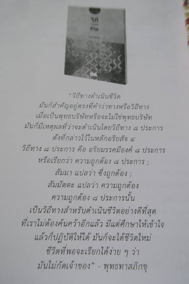 "วิถีทางดำเนินชีวิตมันก็สำคัญอยู่ตรงที่คำว่าทางหรือวิถีทาง เมื่อเป็นพุทธบริษัทหรือจะไม่ใช่พุทธบริษัท มันก็มีเหตุผลที่ว่าจะดำเนินโดยวิถีทาง ๘ ประการ ดังที่กล่าวไว้ในหลักอริยสัจ ๔ วิถีทาง ๘ ประการ คือ อริยมรรคมีองค์ ๘ ประการ หรือเรียกว่า ความถูกต้อง ๘ ประการ ; สัมมา แปลว่า ซึ่งถูกต้อง ; สัมมัตตะ แปลว่า ความถูกต้อง ความถูกต้อง ๘ ประการนั้นเป็นวิถีทางสำหรับดำเนินชีวิตอย่างดีที่สุดที่เราไม่ต้องค้นคว้าอีกแล้ว มีแต่ศึกษาให้เข้าใจแล้วก็ปฏิบัติให้ได้ มันก็จะได้ชีวิตใหม่ ชีวิตที่พอจะเรียกได้ง่ายๆ ว่ามันไม่กัดเจ้าของ" - พุทธทาสภิกขุ