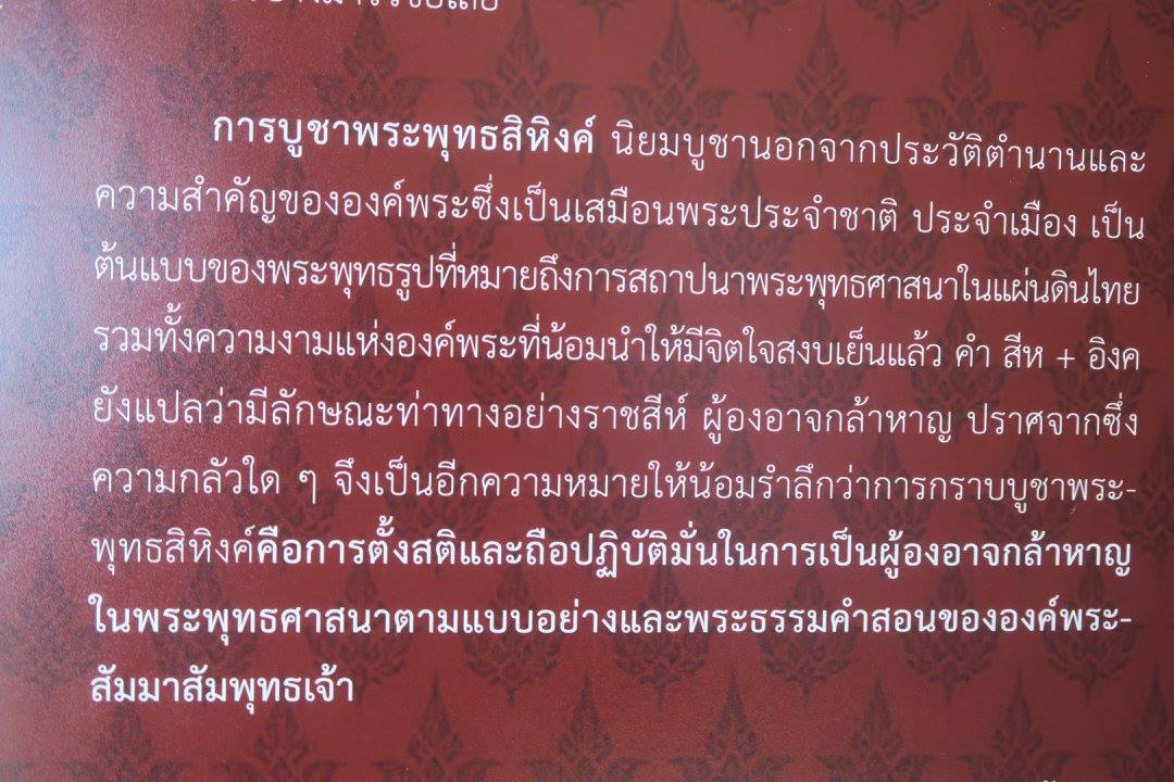 ...เป็นอีกความหมายให้น้อมรำลึกว่าการกราบบูชาพระพุทธสิหิงค์ คือการตั้งสติและถือปฏิบัติมั่นในการเป็นผู้องอาจกล้าหาญในพระพุทธศาสนาตามแบบอย่างและพระธรรมคำสอนขององค์พระสัมมาสัมพุทธเจ้า