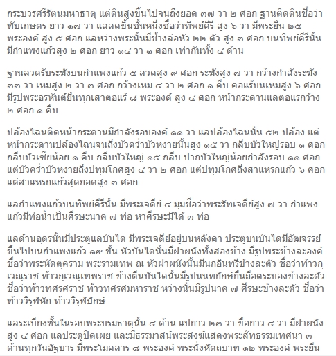 กระบวรศรีรัตนมหาธาตุ แต่ดินสูงขึ้นไปจนถึงยอด ๓๗ วา ๒ ศอก ฐานติดดินชื่อว่าทับเกษตร ยาว ๑๗ วา แลลดขึ้นชั้นหนึ่งชื่อว่าทิพย์คีรี สูง ๖ วา มีพระยืน ๒๕ พระองค์ สูง ๕ ศอก แลหว่างพระนั้นมีช้างล่อหัว ๒๒ ตัว สูง ๓ ศอก บนทิพย์คีรีนั้น มีกำแพงแก้วสูง ๒ ศอก ยาว ๑๔ วา ๑ ศอก เท่ากันทั้ง ๔ ด้าน