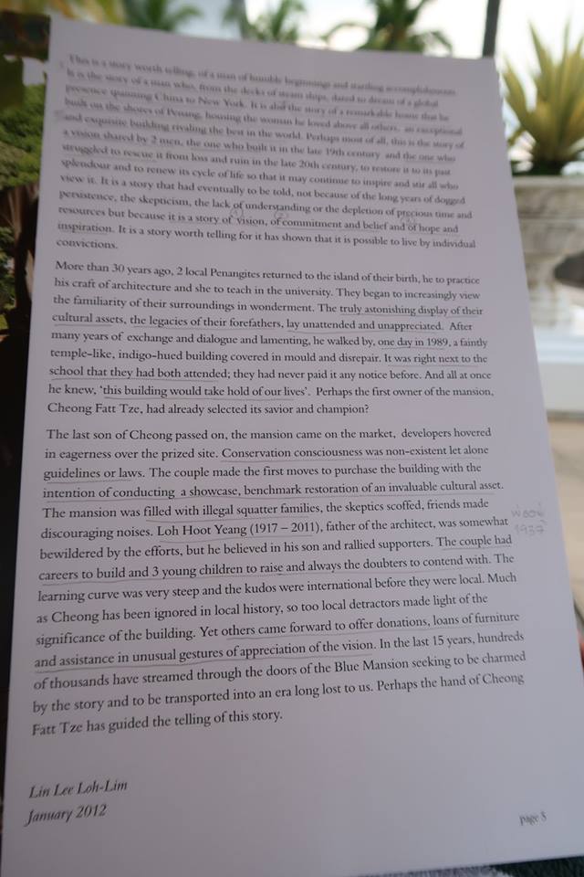 เพราะเรือนนี้เป็นของชาวจีนที่ออกมาแสวงโชคที่อินโดฯ แล้วตั้งหลักได้จากการได้แต่งงานกับลูกสาวเจ้านาย ก่อนที่จะมาปักหลักค้าขายที่ปีนังซึ่งเป็น Free Trade Port จนรวยแหลก ถึงกับฮ่องเต้กว่างสีตั้งเป็นกงสุล แล้วก็ตามให้กลับไปเป็นที่ปรึกษาเศรษฐกิจ ก่อนที่จะยกเป็นเสนาบดีด้านการค้า คุมสารพัดสิ่งในเมืองจีนช่วงปลาย ฯลฯ แล้วตายปัจจุบันในปี ๑๙๑๖ ที่จากาตาร์ โดยในอเมริกายกให้เป็นร็อคกี้เฟลเลอร์แห่งเอเชีย