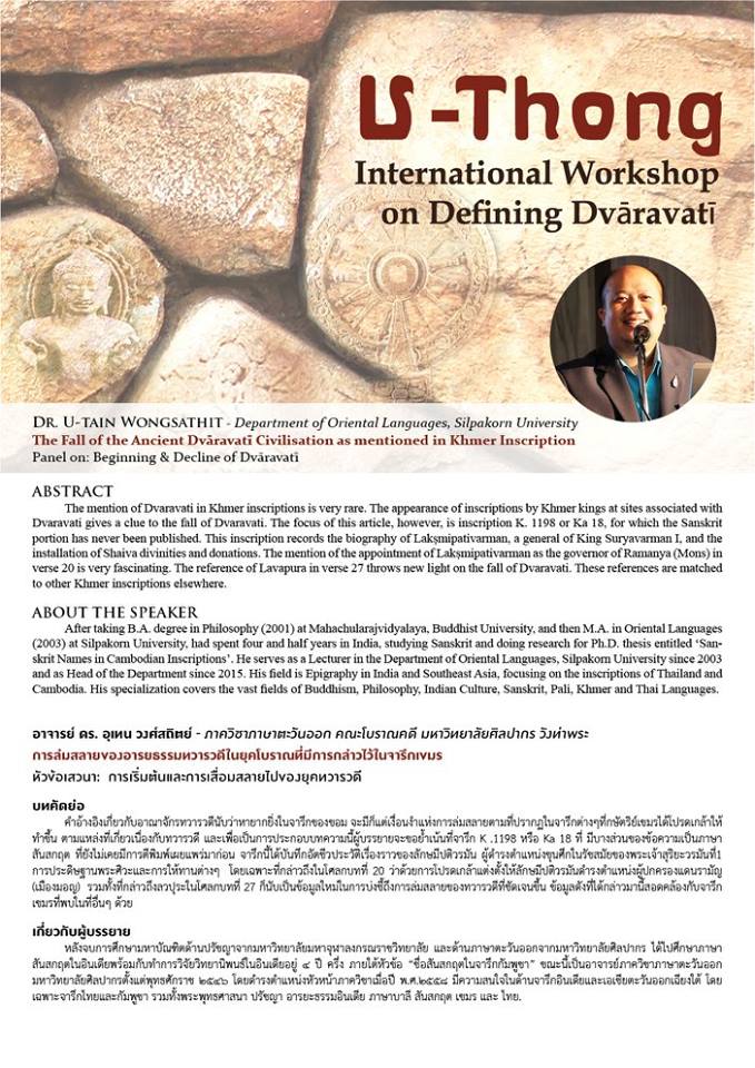 คำอ้างอิงเกี่ยวกับอาณาจักรทวารวดีนับว่าหายากยิ่งในจารึกของขอม จะมีแต่เงื่อนงำแห่งการล่มสลายตามที่ปรากฏในจารึกต่างๆ ที่กษัตริย์เขมรได้โปรดเกล้าให้ทำขึ้นตามแหล่งที่เกี่ยวเนื่องกับทวารวดี และเพื่อเป็นการประกอบบทความนี้ผู้บรรยายจะย้ำเน้นที่จารึก K. 1198 หรือ Ka 18 ที่มีบางส่วนของข้อความเป็นภาษาสันสกฤต ที่ยังไม่เคยมีการตีพิมพ์เผยแพร่มาก่อน จารึกนี้ได้บันทึกอัตชีวประวัติเรื่องราวของลักษมีปติวรมัน ผู้ดำรงตำแหน่งขุนศึกในรัชสมัยของพระเจ้าสุริยะวรมันที่1 การประดิษฐานพระศิวะและการให้ทานต่างๆ โดยเฉพาะที่กล่าวถึงในโศลกบทที่ 20 ว่าด้วยการโปรดเกล้าแต่งตั้งให้ลักษมีปติวรมันดำรงตำแหน่งผู้ปกครองแดนรามัญ (เมืองมอญ) รวมทั้งที่กล่าวถึงลวปุระในโศลกบทที่ 27 ก็นับเป็นข้อมูลใหม่ในการบ่งชี้ถึงการล่มสลายของทวารวดีที่ชัดเจนขึ้น ข้อมูลดังที่ได้กล่าวมานี้สอดคล้องกับจารึกเขมรที่พบในที่อื่นๆ ด้วย