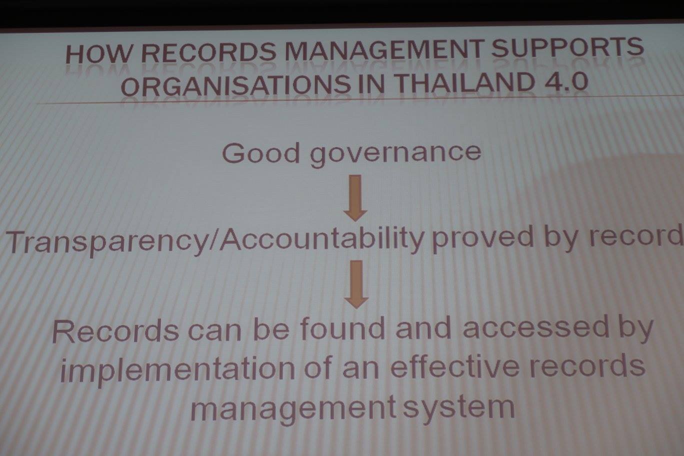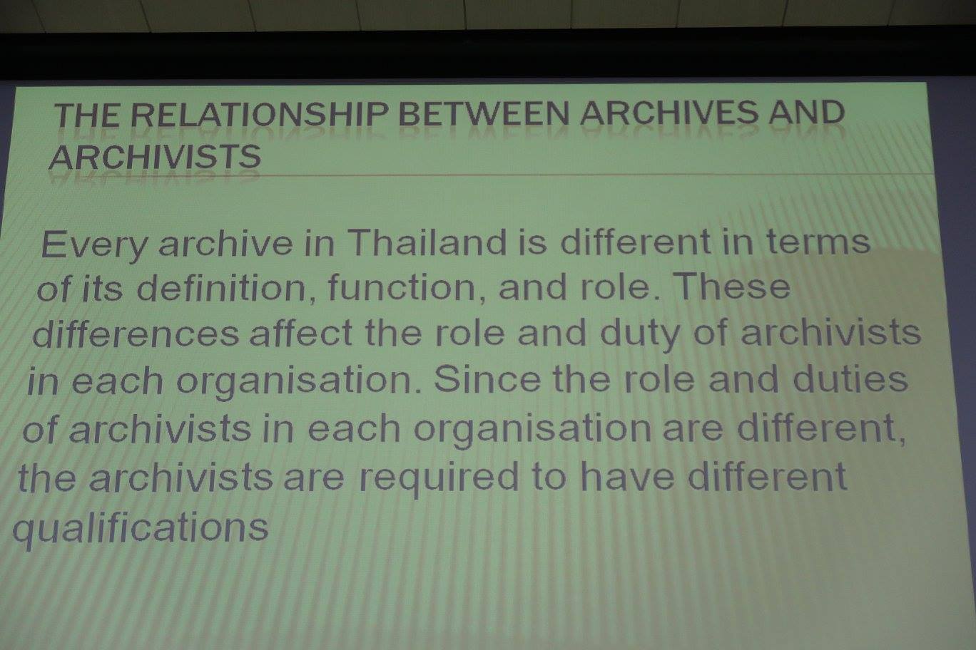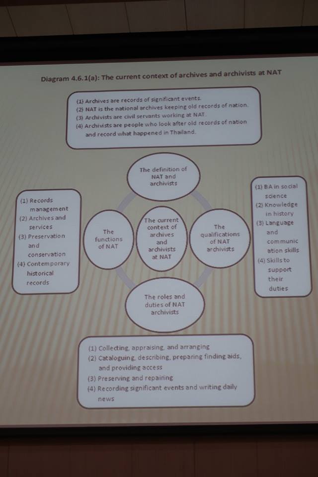 ท่านอาจารย์ได้ทบทวนให้ได้เห็นภาพกว้างของการจดหมายเหตุที่มากกว่าเพียงแค่การเก็บบันทึกข้อมูลประวัติศาสตร์ชาติ โดยสองสไลด์สุดท้ายได้จี้จุดปัญหาของการจดหมายเหตุไทยที่ว่า นอกจากขาดการสร้างนักทำงานด้านนี้แล้ว ยังมีความเข้าใจที่แตกต่างของคนทำและความคาดหวังของชาติ ที่สำคัญคือไม่รู้ชัดว่าการจดหมายเหตุคืออะไรแน่