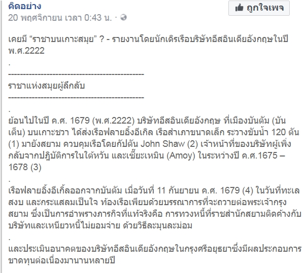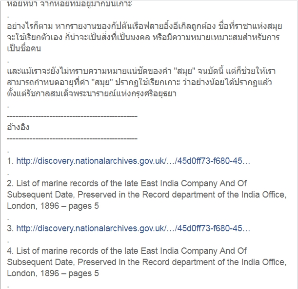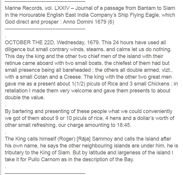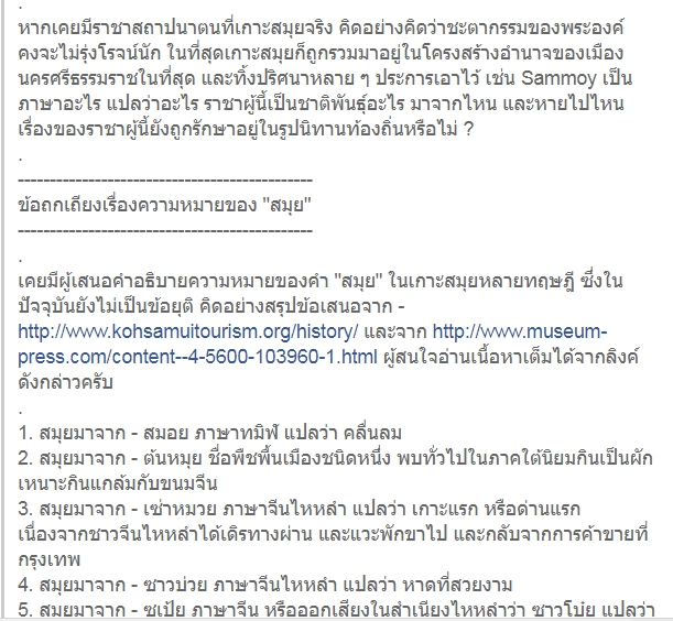 "...ลองดูแผนที่นี้แล้วเทียบเล่นดูซิครับ ชื่อแผนที่ Royaume De Siam, avee Les Royaumes qui lui sont Tributaires, etc วาดราบายสีน้ำบนแผ่นพิมพ์แม่พิมพ์ทองแดง โดย Vincenco Maria Coronelli (มีชีวิตระหว่าง คศ.๑๖๕๐ - ๑๗๑๘) ตีพิมพ์โดย Jean Baptiste Nolin (๑๖๕๗ - ๑๗๑๘) ที่ปารีส ฝรั่งเศส เมื่อปี ค.ศ.๑๖๘๗ ระยะเวลาไล่ ๆ กัน แสดงเส้นทางเดินเรือน่าจะเส้นทางเดียวกัน ผมผมวางจำหน่ายแล้วอดเก็บกลับปไว้ที่เมืองนครไม่ได้ หวังว่าจะได้ใช้ประกอบการตามรอยเมืองนครและรายรอบ ขอบคุณเรื่องเกาะสมุยนี้มากนะครับ อันที่จริงบนเกาะนี้มีสิ่งสำคัญอีกมากมาย ตั้งแต่กลองมโหระทึกใบสำคัญที่ตอนนี้ใบหนึ่ง...