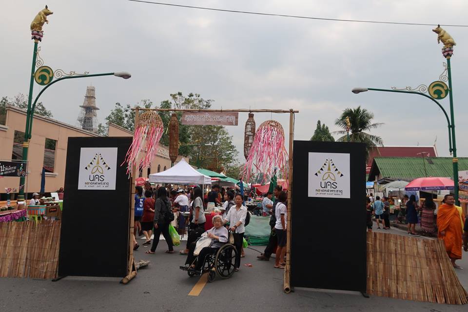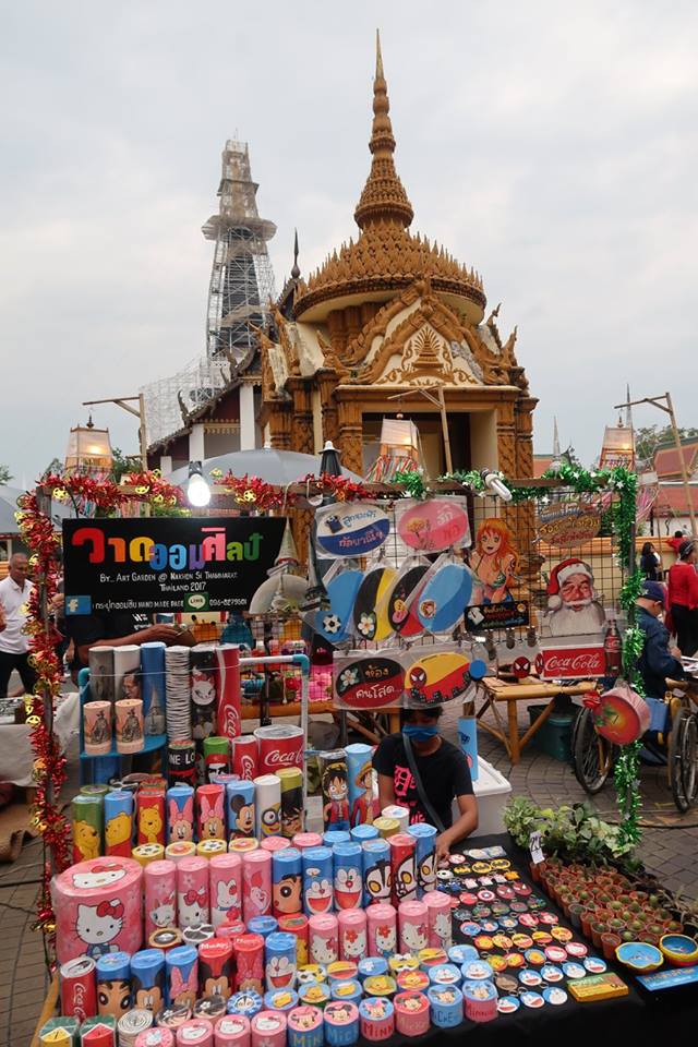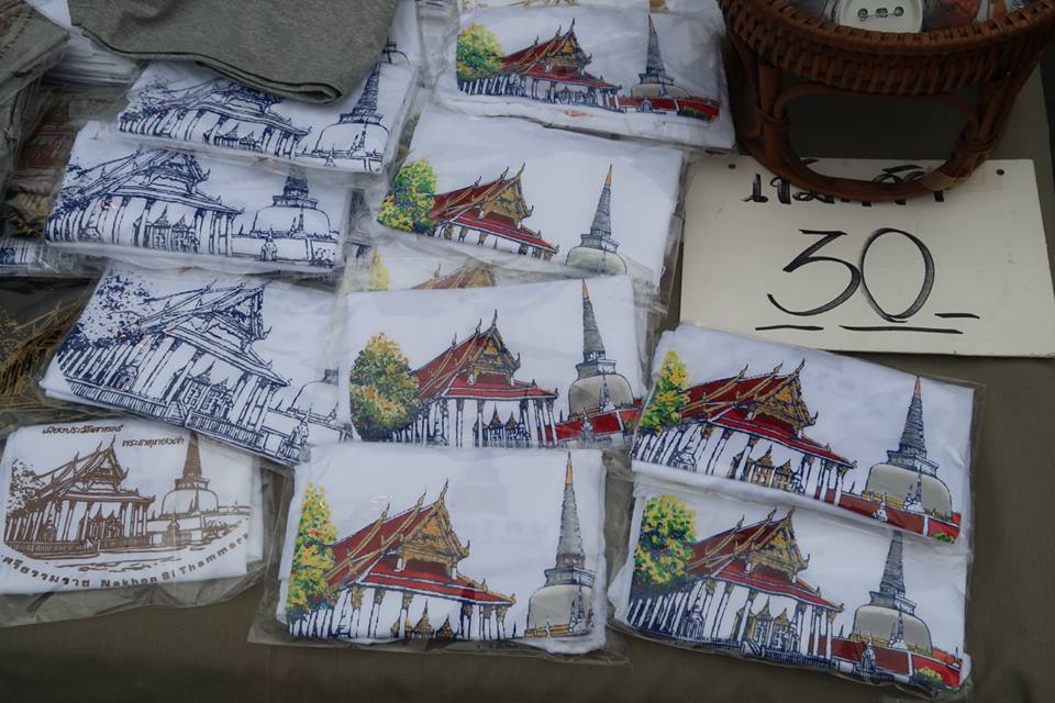 อาจแบ่งเป็น ๕ เขต คือ (๑) ตามริมทางเดินเข้าไปที่หน้าประตูซึ่งถือเป็นนอกเขต (๒) เขตของกินสารพัด (๓) ย่านหน้าองค์พระธาตุที่กันไว้เป็นลานโล่ง มีโคมไฟกรงนก มีจอหนังตลุงกับลานดนตรี มี่ตั่งนั่ง (๔) ย่านหัตถกรรม สินค้าที่ระลึกจิปาถะ (๕) ท้ายสุดก่อนถึงสี่แยกประตูชัยใต้ มีอาหารอีกย่านหนึ่ง ซึ่งดู ๆ แล้วอาหารน่าจะได้สัดส่วนพื้นที่สูงและขายได้มากกว่าอื่นเป็นธรรมดา มีผลิตภัณฑ์-สินค้าที่เป็นอัตลักษณ์ถิ่นไม่มากนัก แต่ก็มีเป็นสีสันได้ไม่น้อย มีแม้กระทั่งเครื่องถมนครที่มาทำสาธิตชิ้นพิเศษด้วย รวมทั้งเสื้อยืดรูปพระธาตุและอื่น ๆ รวมทั้งแผงขายเครื่องเคลือบสังกะสี ของลูกชายพี่เฉลิม พงศ์วัชร ที่ผมอดเอาช้อนหางสังกะสี ๑๐ สีกลับมาบ้านไม่ได้