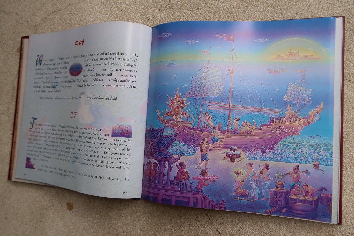 ทูลดังนี้แล้ว ให้พระมารดาประทานทรัพย์กึ่งหนึ่ง จำหน่ายออกเป็นสินค้าแล้วให้ขนขึ้นเรือพร้อมกับพวกพาณิชที่จะเดินทางไปสุวรรณภูมิ. แล้วกลับมาถวายบังคมลาพระมารดา ทูลว่า : “ข้าแต่พระมารดา หม่อมฉันจักไปเมืองสุวรรณภูมิ.”