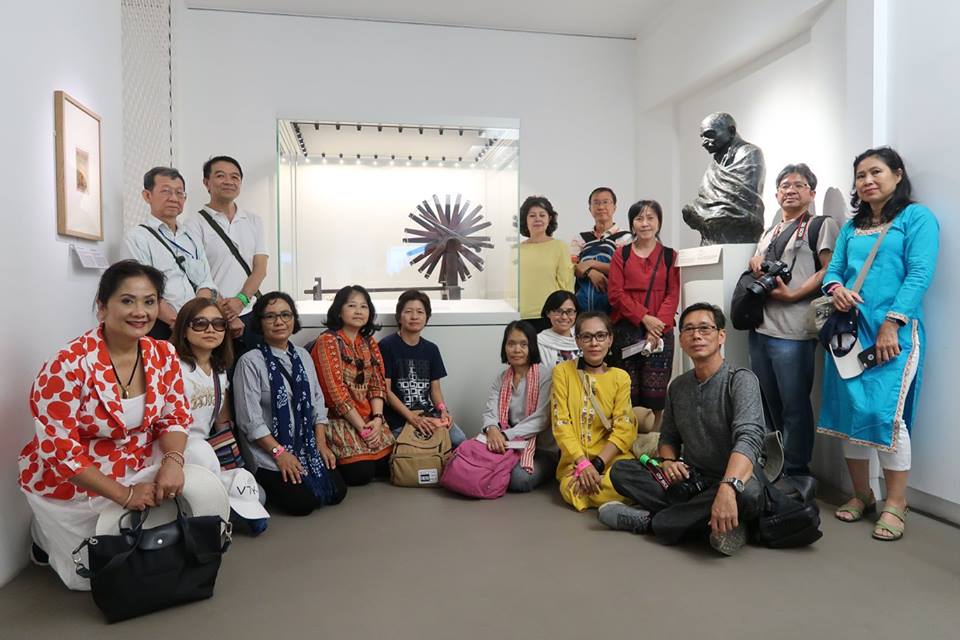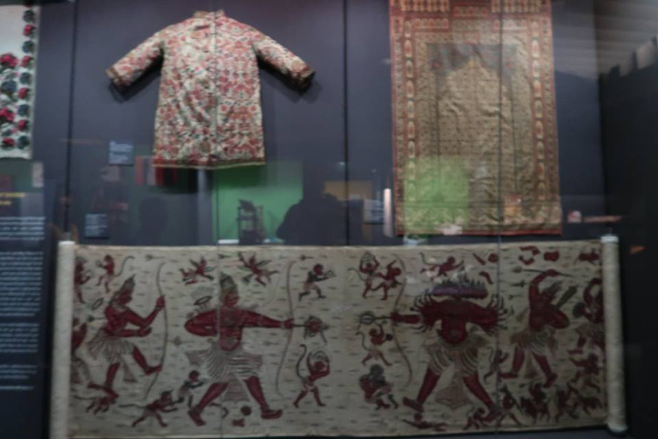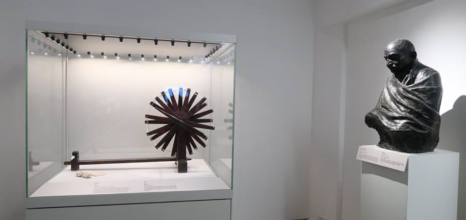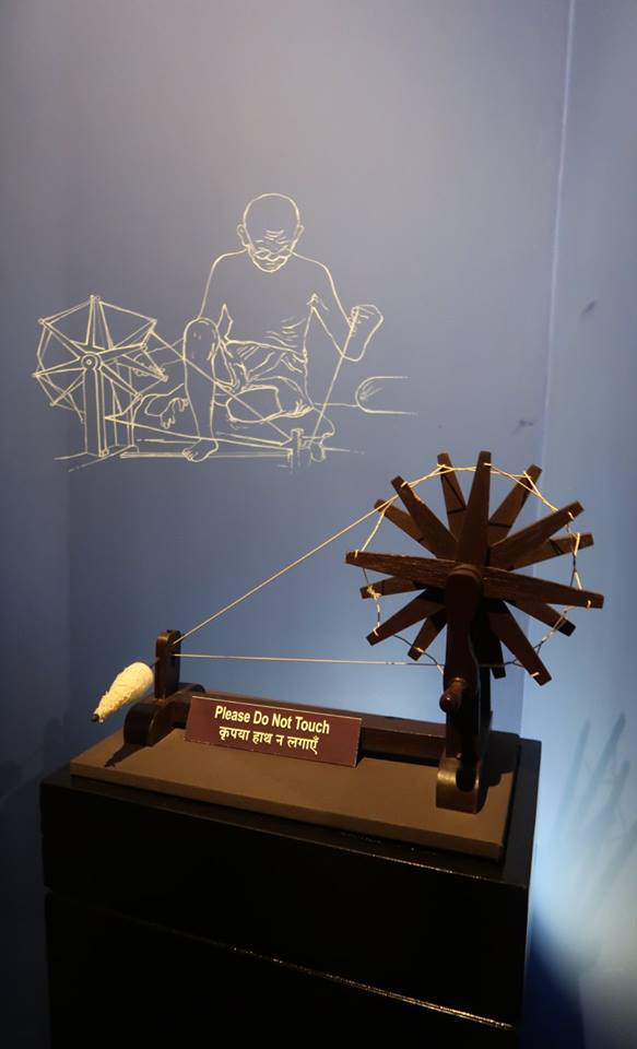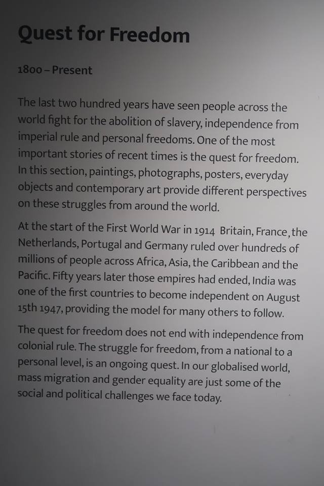 ที่ท้ายปลายเกือบสุดนิทรรศการพิเศษ ที่เขากล่าวถึงการสู้เพื่ออิสรภาพแห่งชาติ โดยมหาตมะคานธี ด้วยผ้าผืนและฟื้นการทอใช้ แล้วผมพาแว่บเข้าห้องแสดงผ้าอินเดียที่สวยมาก ๆ แต่มีเวลาน้อย ทั้ง ๆ ที่เป็นผู้ผลิตผ้ารายใหญ่ให้โลก แต่อินเดียกลับต้องซื้อใส่สวมเสื้อผ้าจากโรงงานอังกฤษ คานธีจีจึงรณรงค์ใหม่ ให้กลับมาปั่นด้ายฝ้ายทอสวมใส่กันเอง ก่อนที่จะค่อย ๆ ขยายขบวนออกไปเรื่อย ๆ กว่าจะได้อิสรภาพกลับคืนสู่อินเดียก็แสนยาก จากนั้นก็ยังรบกันไม่เลิก แถมแยกประเทศออกไปแล้ว ๒ มิหนำซ้ำภายในประเทศก็เกิดการแตกต่างและช่องว่างสารพัด ทั้งสุดรวยและแสนจน จนล้นประเทศ ฯลฯ ก็ยังเพียงแค่อิสรภาพจากต่างชาติ แต่ในร่วมชาติ ? และยังห่างมากจากอิสรภาพที่แท้ ดังที่อโศกมหาราชประกาศไว้ และที่สมณโคดมทรงค้นพบ