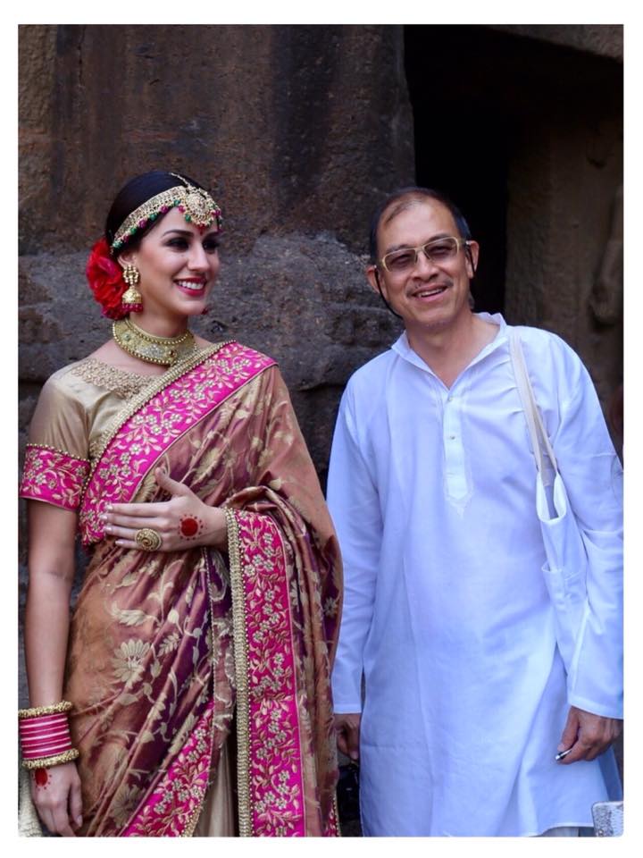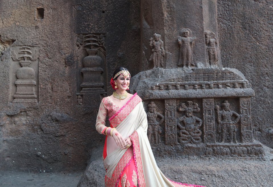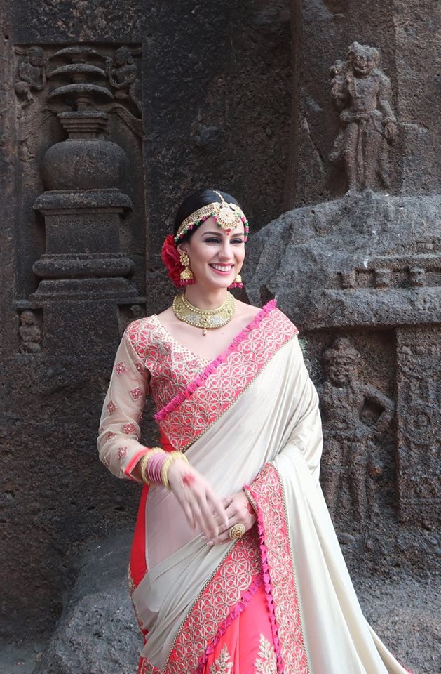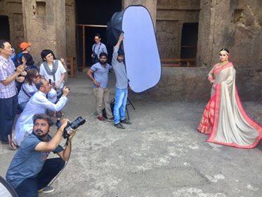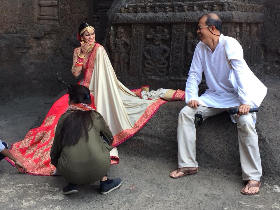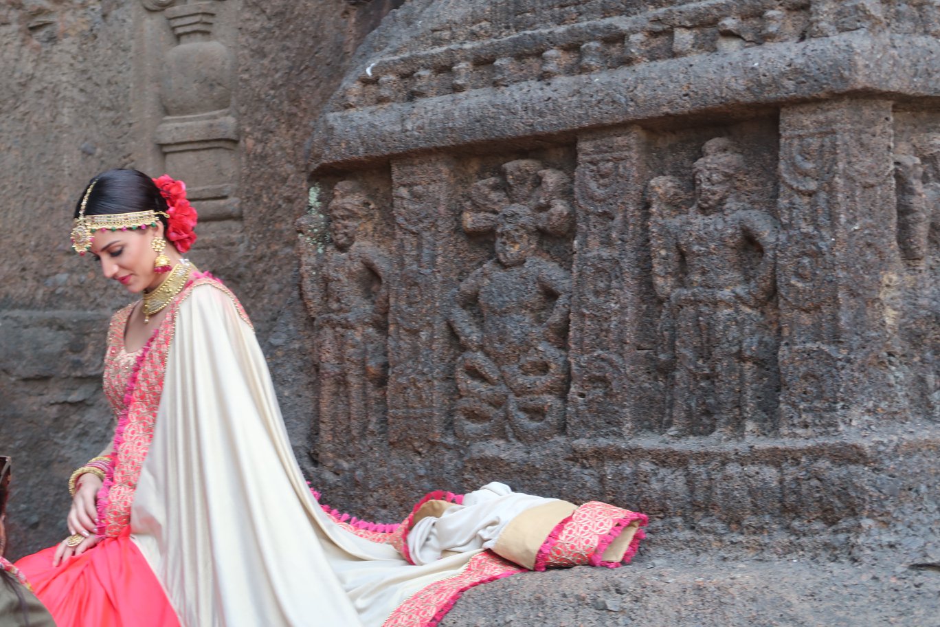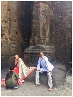 พอพาเดินต่อไปที่ถ้ำหมายเลข ๓ ที่รู้อยู่ว่ากำลังมีการถ่ายแบบ แต่จะข้าม ก็เกรงว่าจะพลาด แถมหลายคนก็ล่วงเข้าไปกันแล้ว ที่ไหนได้ ไม่มีใครเข้าไปในถ้ำกันเลย ยกเว้นพระ เห็นกำลังมุง ๆ ขอถ่ายรูปด้วย แถมผู้จัดการก็ตะโกนยิ้มแย้มว่า "เร็ว ๆ" พวกเราก็เลยยิ่งถ่ายกันใหญ่ ผมไม่รู้จะรีบเรียกคณะเข้าถ้ำทำไม ก็เลยรีบเข้าไปถ่ายบ้าง อย่างที่เห็น ขากลับออกมา เขายังถ่ายไม่เสร็จ พวกเราก็มุงถ่ายเขาอีก ผมก็ถ่ายบ้างเป็นธรรมดา อยู่ ๆ ก็มีอัปสราเป็น ๆ มาประกอบฉาก จะพลาดได้อย่างไร แถมมุมที่เธอยืนตอนขาออกนี้งามมาก เห็น ๒ สถูป และอื่น ๆ ลงตัวดี ที่สำคัญ ตรงนี้ คือที่ อ.กังวล บอกว่า "พบจารึกเยธัมมาฯ ที่น่าจะเก่าแก่ที่สุด" แต่ที่ตรงตามคาถาพระอัสสชิเป๊ะ ๆ ก็คือว่า... พอดีเขาพักการถ่ายภาพ ผู้ช่วยเข้าไปแต่งผ้าส่าหรีให้ คุณ Larissa Bonesi ผมก็เลยปล่อยไปตามเหตุและปัจจัย เดินเข้าไปขอนั่งถ่ายด้วยเล่น ๆ ทำเอาเธอทำเป็นเขิน สมเป็นยอดนางแบบอินเดียเลยครับ ขณะที่ผมเองนั้น หน้าเป็นอย่างประหลาด ขนาดเลยออกมาแล้วถ่ายกลับไป จะเอาให้ครบวิหารถ้ำและรั้วหน้ายังติดเธอมาเลย เอิงเอย.