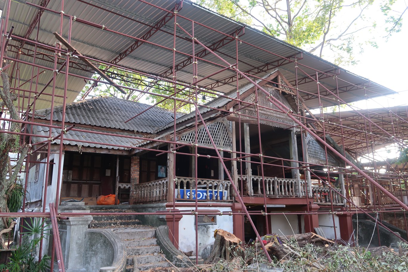 และการสร้างนั่งร้านมุงหลังคาผ่านมาแล้วหลายวัน ผมได้ล่วงเขตเข้าไปเดินดูจนทั่วทั้ง ๒ หลัง คือหลังตะวันออก ที่สร้างเมื่อปี พ.ศ.๒๔๕๘ และหลังตะวันตก