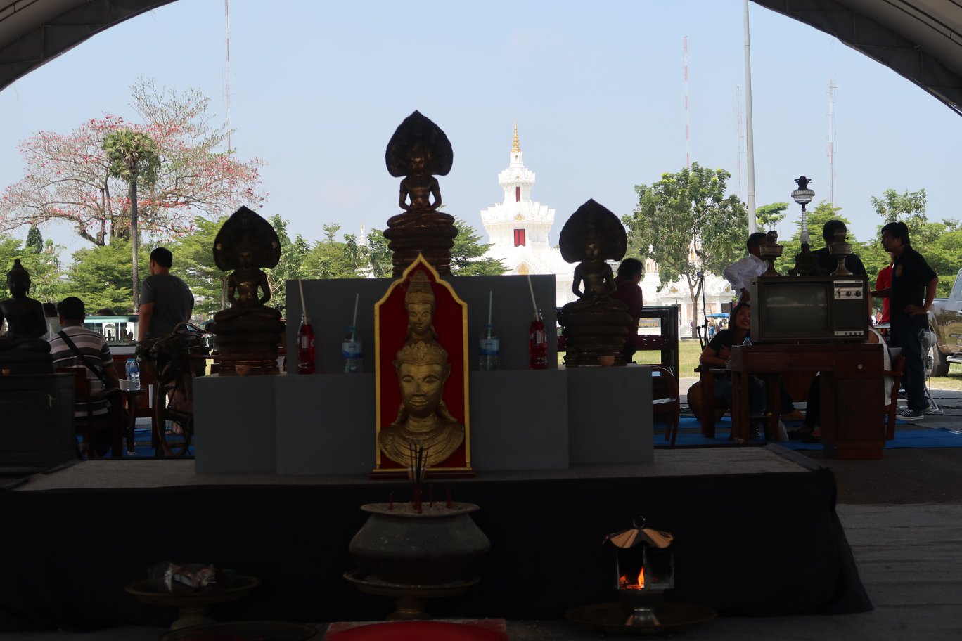 ๓) มีพิธีกรรมและนิทรรศการที่บนโรงละคร-หอประชุม ซึ่งเพิ่งเลิกกิจกรรมและพิธี ได้เห็นแต่เพียงที่เขากำลังรื้อ มีรูปพระหลายองค์
