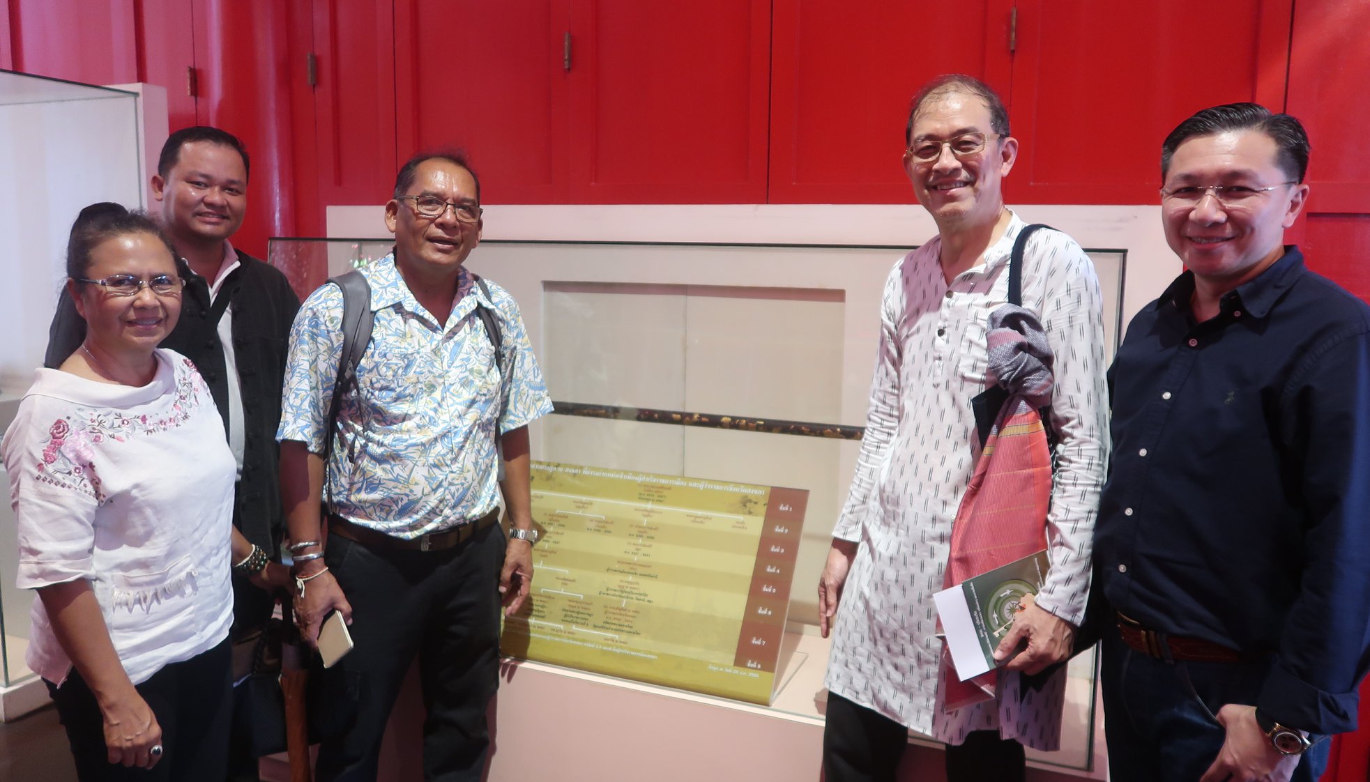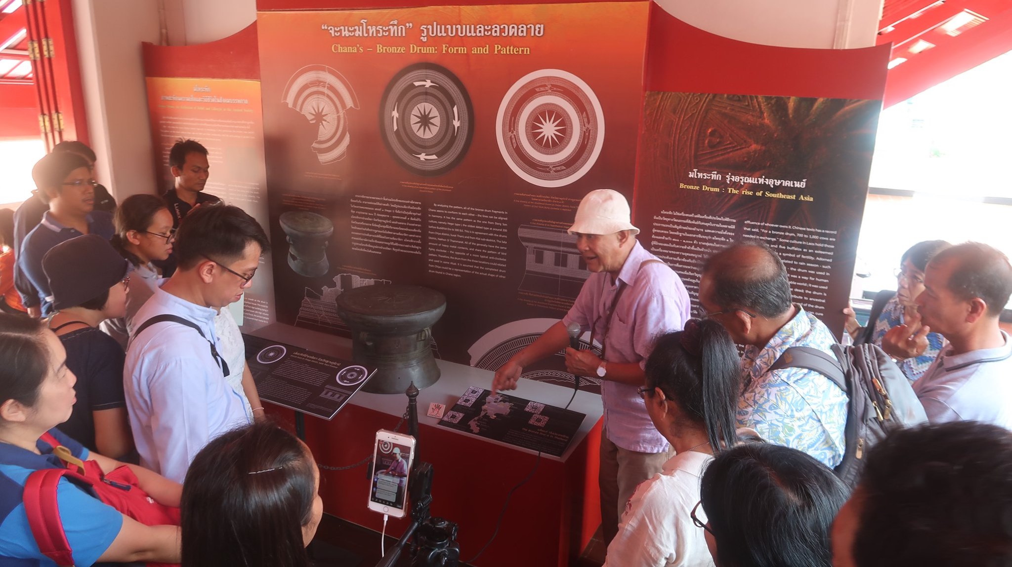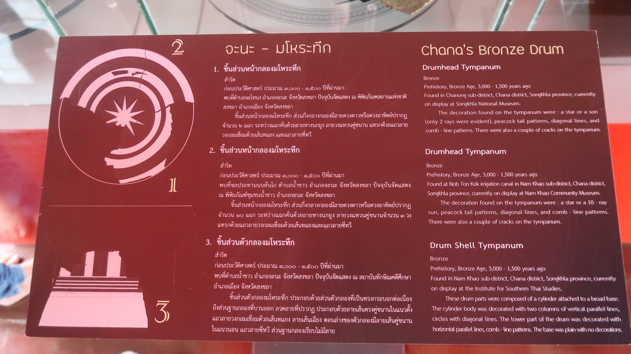 ที่พิพิธภัณฑ์ฯ สงขลานั้น มี ๒ จุดแสดงพิเศษที่ไม่ควรพลาดแม้วันนั้นผมเองจะพลาดไปจุดหนึ่ง คือจากเมืองยะรังแต่จุดนี้ที่ไม่พลาด คือจุดแสดงกลองมโหระทึกที่จะนะ น่าสนใจมากเพราะว่าพบ ๓ คราว ใน ๓ พื้นที่และทุกวันนี้ก็เก็บรักษาจัดแสดงไว้ ๓ สถาน โดยพบว่าทั้ง ๔ ชิ้นนี้ หากเอามาต่อกันเข้า ก็คือกลองใบเดียวกันแถมมีการวิเคราะห์เนื้อสำริดแล้วเข้ากันได้ระบุว่า เป็นเฮเกอร์แบบที่ ๑ และมีรูปลักษณะเหมือนกันมากกับที่พบที่ไชยาและปากคลองกลายอาจแสดงว่า ๓ บริเวณนี้มีความสัมพันธ์กัน ??? ท่าน อ.ศรีศักร ช่วยชี้ย้ำว่านี้ เป็นสินค้ามีค่าของย่านทะเลจีนใต้เมื่อ ๓,๐๐๐ ปีที่แล้วและพบรายรอบ โดยเฉพาะบนคาบสมุทรภาคใต้ไทยฝั่งตะวันออกตลอดแนวแต่ละจังหวัด เจอกันหลาย ๆ ใบโดยเฉพาะชุมพร สุราษฎร์ นคร สงขลาดูเหมือนว่าจะพบเพียงใบเดียวนี้ฝากคนจะนะตามดูแลเรื่องนี้ที่สงขลาด้วยหนอเห็นขยันเฝ้าแต่ทะเล ๆ ๆ ไหน ๆ ก็เป็นเชื้อเป็นสายของเจ้าเมืองสงขลากะเขา