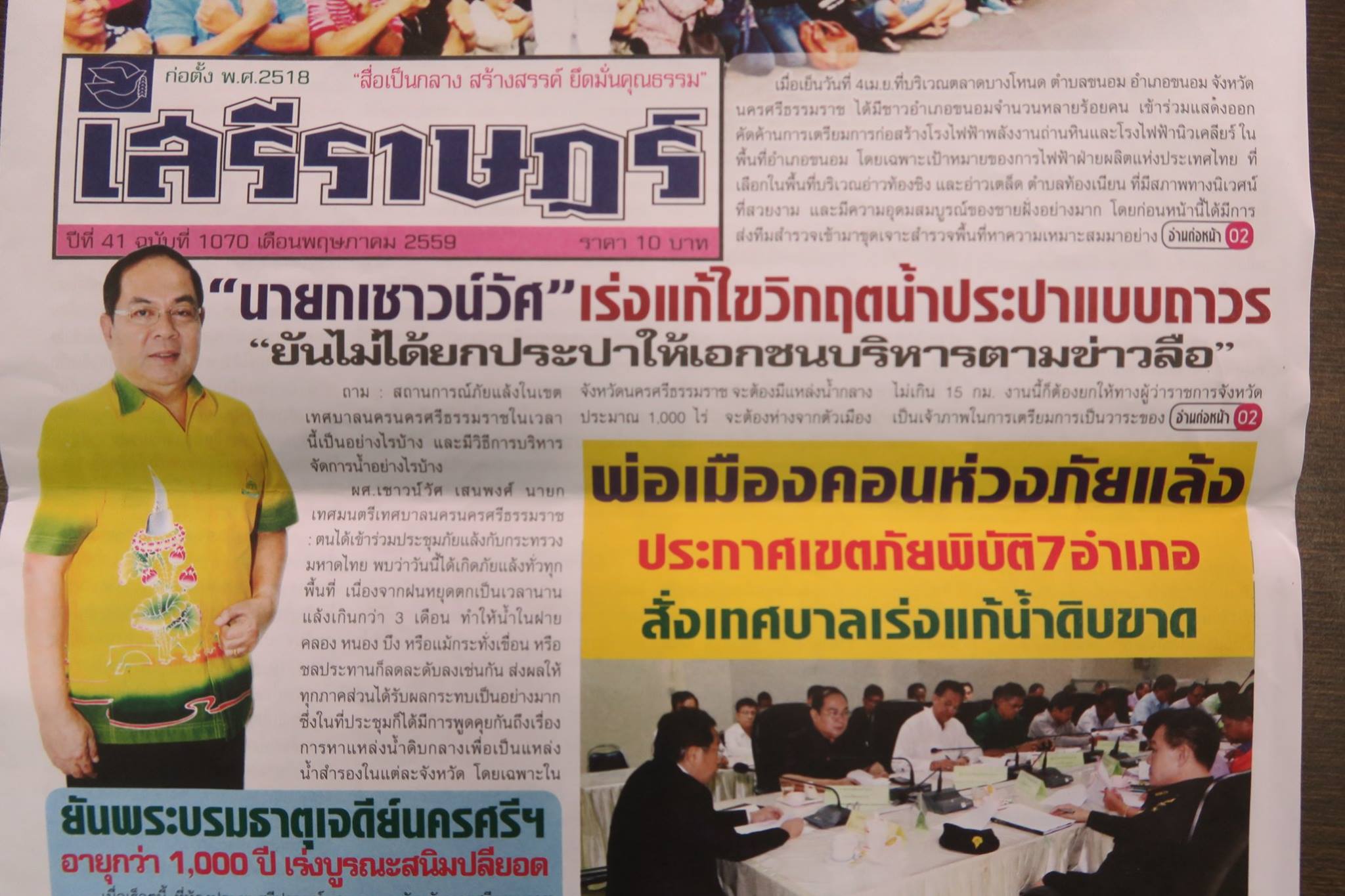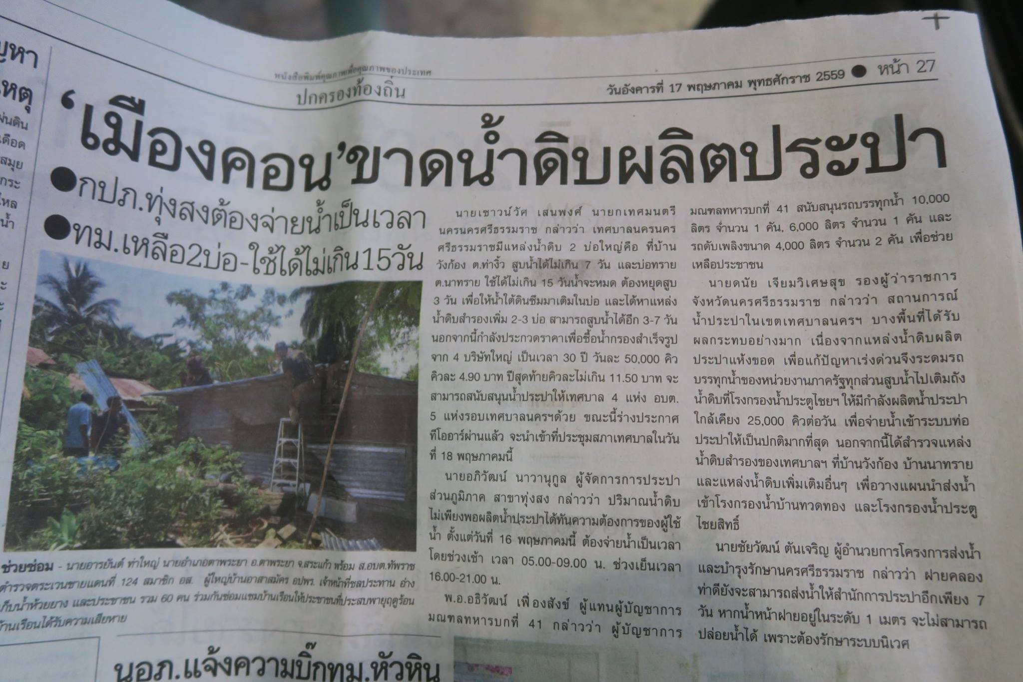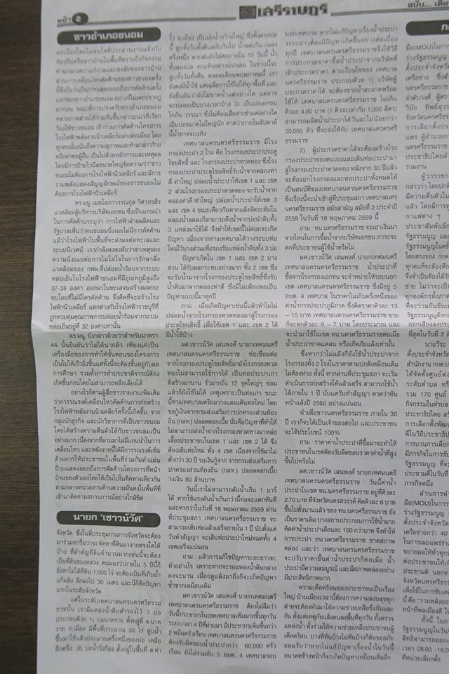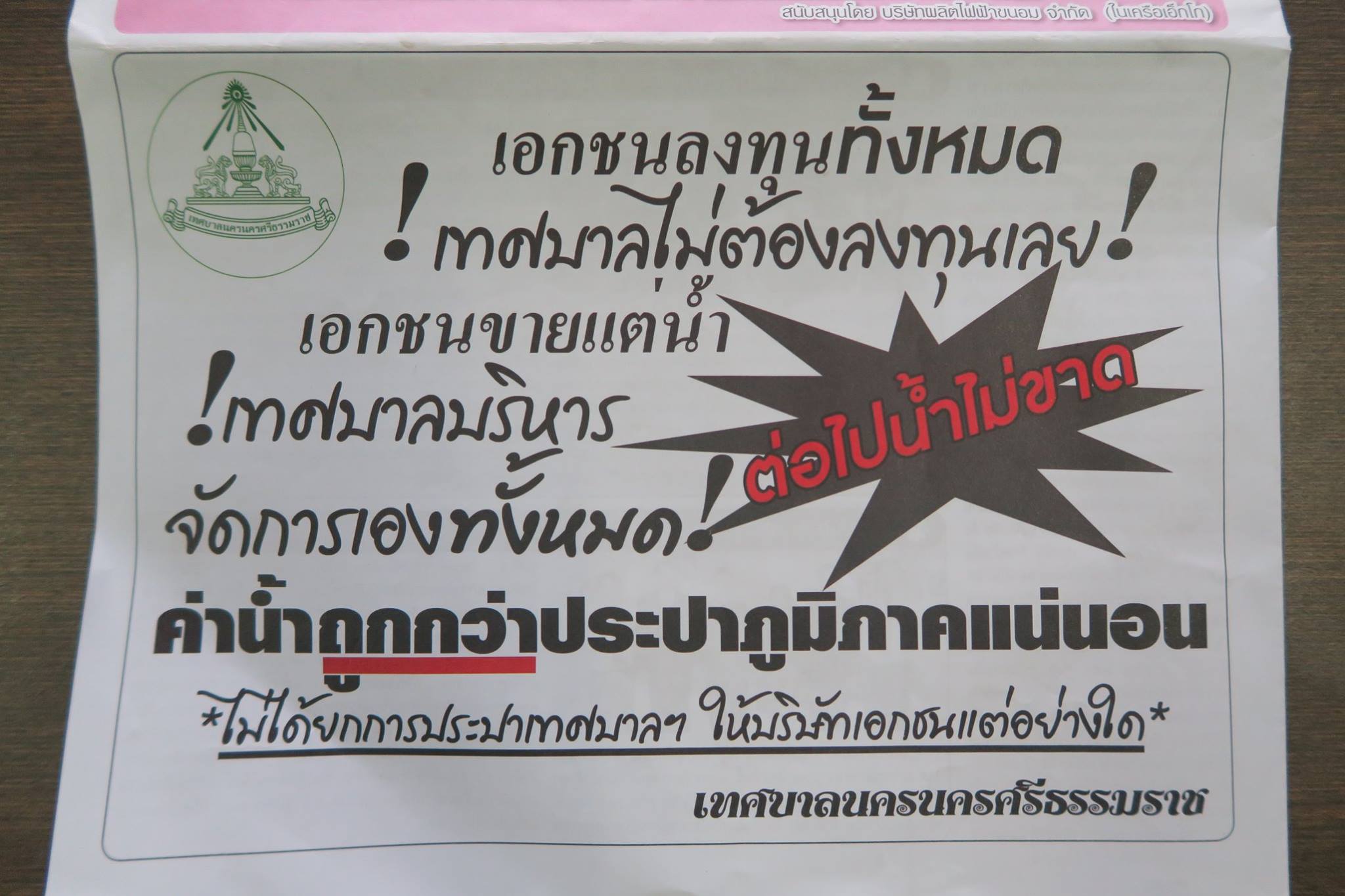 สมุนน้อยในบ้านกลับมาจากโรงเรียนวัดศรีทวี บอกว่ามีหนังสือนายกฝากถึงผู้ปกครองว่า "เทศบาลนครฯ ได้ประชุมหารือกับทุกภาคส่วนเพื่อหาแหล่งน้ำสำรองในเขตเทศบาลฯ และจังหวัดฯ เพื่อแก้ปัญหาวิกฤตน้ำประปาในปัจจุบันและระยะยาว โดยเทศบาลจะประกวดราคาซื้อน้ำประปาที่กรองแล้วในราคาถูกให้กับประชาชนที่อาศัยในเขตเทศบาลและนอกเขตเทศบาล เพื่อบรรเทาความเดือดร้อนในหน้าแล้ง โดยที่เทศบาลมิได้ลงทุนแต่ประการใด เทศบาลฯ หวังเป็นอย่างยิ่งว่าผู้ปกครองคงเข้าใจและให้ความเป็นธรรมกับเทศบาลฯ ต่อไป" ทั้งนี้มีเย็บแนบหนังสือพิมพ์เสรีราษฎร์ฉบับเดือนพฤษภาคม ๒๕๕๙ ที่รายงานข่าวเรื่องน้ำเมืองนครพร้อมบทสัมภาษณ์ของนายกฯ เชาวน์วัส อย่างละเอียดยิบ