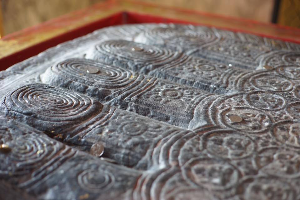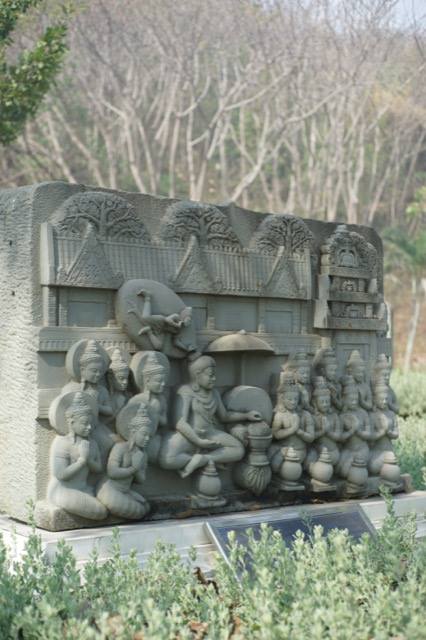 ลงมาจากเขาดีสลัก เราจะพบงานพุทธศิลป์ที่น่าสนใจอีกจุดหนึ่ง คือกลุ่มหินสลักเป็นภาพพุทธประวัติ เป็นงานของช่างยุคปัจจุบันที่มีคววามวิจิตรสวยงาม แต่ละชิ้นเล่าเรียงพุทธประวัติตอนต่างๆ อย่างเป็นลำดับ หินสลักเหล่านี้ได้ทำการศึกษาแนวทางจากหินสลักยุคทวารวดีที่พบในที่ต่างๆ ในประเทศไทยโดยเฉพาะในภาคอีสาน แล้วเอามาทำใหม่ให้เป็นงานที่ฝากไว้ในยุคนี้ ...ในภาพนี้เป็นพุทธประวัติตอนแบ่งพระบรมสารีริกธาตุ ซึ่งเป็นตอนท้ายๆ ของพุทธประวัติแล้ว ใครสนใจอยากชมพุทธประวัติตอนอื่นๆ เราขอแนะนำอย่างยิ่งให้หาโอกาสไปชื่นชมพุทธประวัติผ่านหินสลักชุดนี้ให้ได้สักครั้งจริงๆ