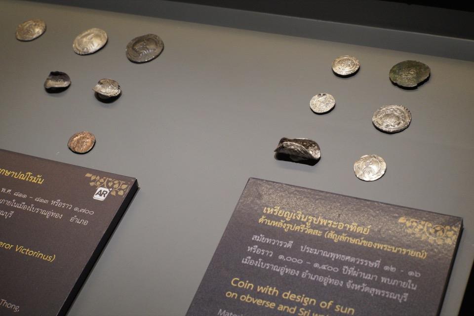 เหรียญเงินที่ขุดพบที่อู่ทองเป็นโบราณวัตถุที่บอกเล่าเรื่องราวได้มากมาย ที่มาอันแตกต่างหลากหลายแสดงถึงการเชื่อมต่อของวัฒนธรรมและการค้าขายในยุคโบราณที่กว้างไกลเหลือเชื่อ อย่างในภาพนี้จะเห็นว่ามีทั้งเหรียญเงินพระอาทิตย์ที่ด้านหลังมีรูปสัญลักษณ์ของพระนารายณ์ซึ่งเป็นวัฒนธรรมแบบฮินดู วางโชว์ใกล้ๆ กับเหรียญโรมันสมัยพระเจ้าวิคโตรินุส และก็เหรียญโบราณนี่เองที่เป็นที่มาของคำว่า “ทวารวดี” เพราะที่โบราณสถานคอกช้างดินในอู่ทองนี่เอง ที่มีการขุดพบเหรียญเงินที่จารึกอักษรปัลลวะ ภาษาสันสกฤต เป็นคำว่า “ศรีทวารวดี ศวรปุณย” แปลว่า “การบุณย์แห่งพระเจ้าศรีทวารวดี” ซึ่งเหรียญดังกล่าวก็จัดแสดงอยู่ในพิพิธภัณฑสถานแห่งชาติอู่ทองด้วย