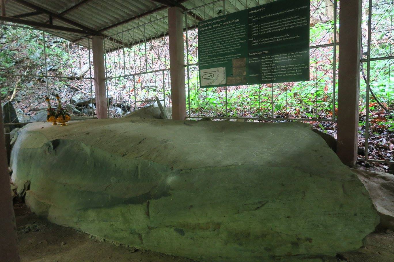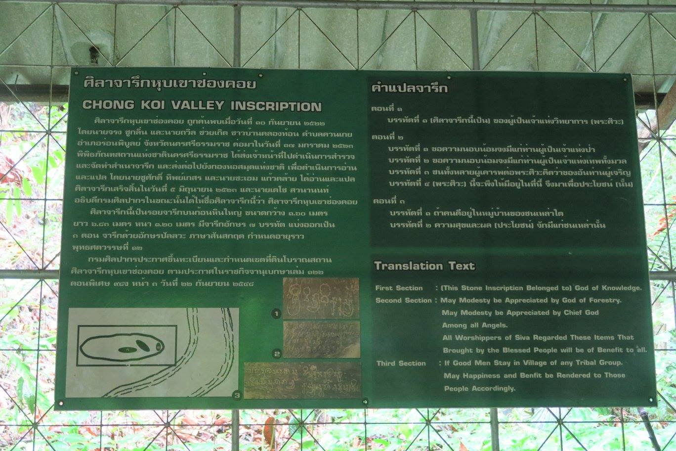 จารึกนี้สำหรับผมถือว่าสำคัญมากเพราะบอกอะไรหลายอย่าง ทั้งตั้งอยู่กลางป่า ยืนยันการเป็นเส้นทางข้ามคาบสมุทรช่วง นคร-ทุ่งสง-ตรัง เมื่อกว่า ๑,๐๐๐ ปีก่อน ทั้งรับรองว่าชนชาวอินเดียที่นับถือพระศิวะเป็นผู้มาสร้างทำที่นี่ เพราะน่าจะแบกหินนี้มาไม่ไหว และที่สำคัญ คือ "เชิดชูคนดี"