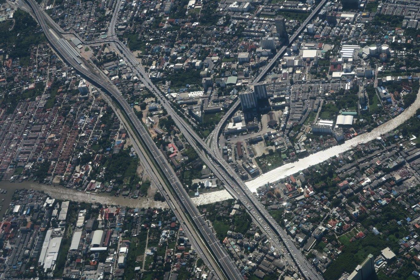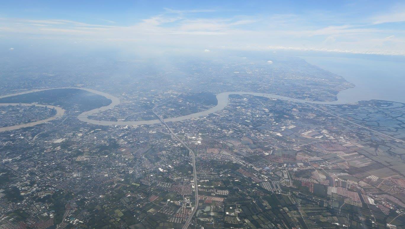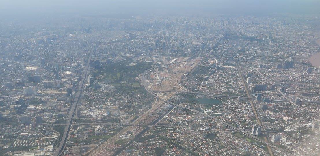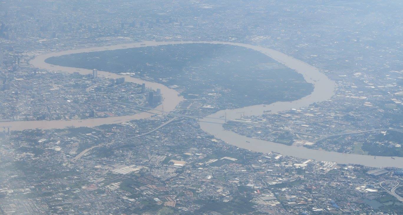 ที่น่าดูมากคือเป็นภาพที่ไล่ตามถนนวิภาวดีรังสิตลงมาถึงจตุจักรที่เห็นสวนรถไฟเป็นขุมเขียวเดียวอยู่กลางกรุงติดกับบริเวณที่กำลังก่อสร้างระบบสัญจรคมนาคมสร้างขนานใหญ่อยู่ และสวนโมกข์กรุงเทพก็ตั้งอยู่ ณ ตรงนั้นโดยยังไม่รู้ว่าอนาคตบริเวณนี้จะเป็นอย่างไรต่อไป แต่ที่ติดใจมาก ๆ ก็ตอนที่เห็นโค้งน้ำเจ้าพระยาโดยมีเส้นทางพิเศษอะไรสักอย่างตีโค้งคั่นไว้ก่อนที่จะยาวเหยียดคดเคี้ยวไปไกลลิบลับ แล้วจึงผ่านย่านพาณิชยกรรมที่เต็มไปด้วยตึกระฟ้า มีวงโค้งใหญ่ที่พระเจ้าอยู่หัวให้ตัดคลองลัดโพธิ์ที่เป็นจุดหมายตา แล้วจึงวกดิ่งลงสู่อ่าวไทยเป็นปากเจ้าพระยาชั้นในก่อนที่จะเลียบชายฝั่งของก้นอ่าวไทยฟากตะวันออกไปถึงปากน้ำบางปะกงที่ไหลลงมาจากปราจีนบุรี - ศรีมโหสถ แล้วก็ถึงศรีราชา เห็นเกาะล้าน กับหมู่เมฆมากจนไม่เห็นพัทยา เห็นแต่แหลมฉบังอยู่ลิบ ๆ แล้วอีกทีก็เป็นสัตหีบกับเกาะต่าง ๆ ที่ปลายจงอยซึ่งอาจจะถึงเป็นปากเจ้าพระยาชั้นนอก จากนนั้นก็เห็นแต่เมฆ ฟ้ากับทะเลจนไปถึงอ่าวนคร-ปากพนังที่เห็นปลายแหลมตะลุมพุกอยู่ลิบ ๆ ที่ขอบฟ้า