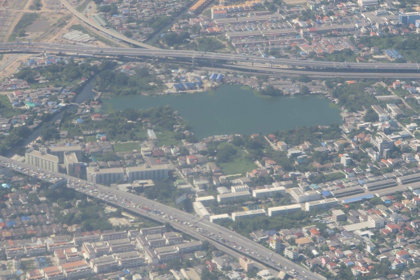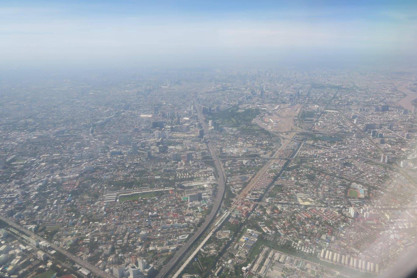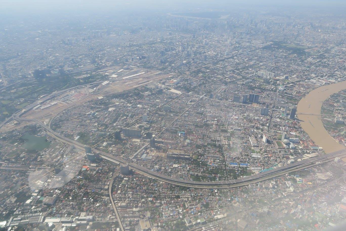 ที่น่าดูมากคือเป็นภาพที่ไล่ตามถนนวิภาวดีรังสิตลงมาถึงจตุจักรที่เห็นสวนรถไฟเป็นขุมเขียวเดียวอยู่กลางกรุงติดกับบริเวณที่กำลังก่อสร้างระบบสัญจรคมนาคมสร้างขนานใหญ่อยู่ และสวนโมกข์กรุงเทพก็ตั้งอยู่ ณ ตรงนั้นโดยยังไม่รู้ว่าอนาคตบริเวณนี้จะเป็นอย่างไรต่อไป แต่ที่ติดใจมาก ๆ ก็ตอนที่เห็นโค้งน้ำเจ้าพระยาโดยมีเส้นทางพิเศษอะไรสักอย่างตีโค้งคั่นไว้ก่อนที่จะยาวเหยียดคดเคี้ยวไปไกลลิบลับ แล้วจึงผ่านย่านพาณิชยกรรมที่เต็มไปด้วยตึกระฟ้า มีวงโค้งใหญ่ที่พระเจ้าอยู่หัวให้ตัดคลองลัดโพธิ์ที่เป็นจุดหมายตา แล้วจึงวกดิ่งลงสู่อ่าวไทยเป็นปากเจ้าพระยาชั้นในก่อนที่จะเลียบชายฝั่งของก้นอ่าวไทยฟากตะวันออกไปถึงปากน้ำบางปะกงที่ไหลลงมาจากปราจีนบุรี - ศรีมโหสถ แล้วก็ถึงศรีราชา เห็นเกาะล้าน กับหมู่เมฆมากจนไม่เห็นพัทยา เห็นแต่แหลมฉบังอยู่ลิบ ๆ แล้วอีกทีก็เป็นสัตหีบกับเกาะต่าง ๆ ที่ปลายจงอยซึ่งอาจจะถึงเป็นปากเจ้าพระยาชั้นนอก จากนนั้นก็เห็นแต่เมฆ ฟ้ากับทะเลจนไปถึงอ่าวนคร-ปากพนังที่เห็นปลายแหลมตะลุมพุกอยู่ลิบ ๆ ที่ขอบฟ้า