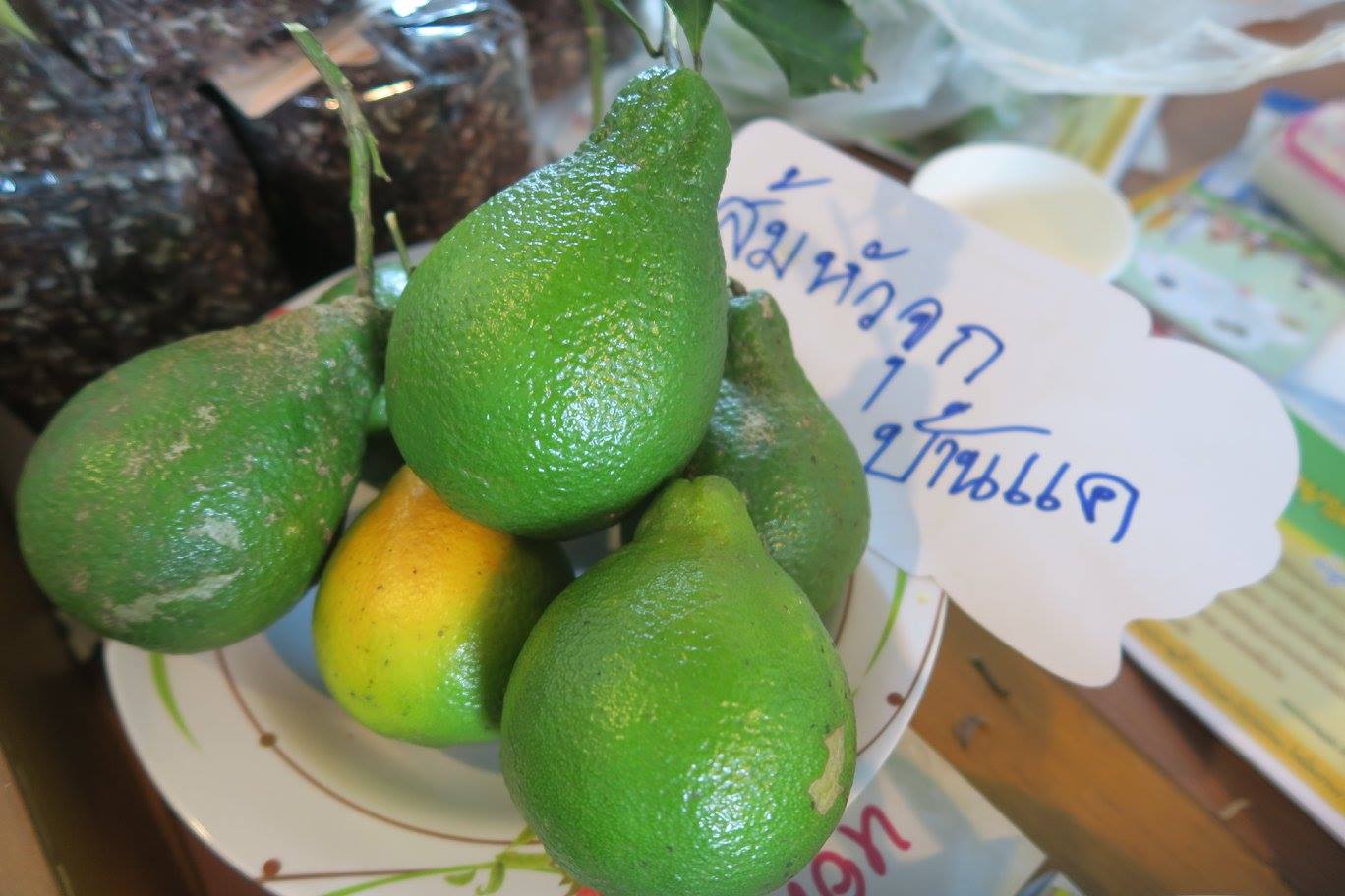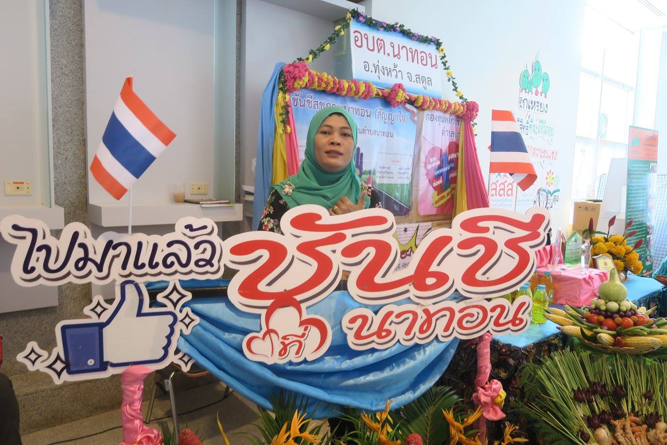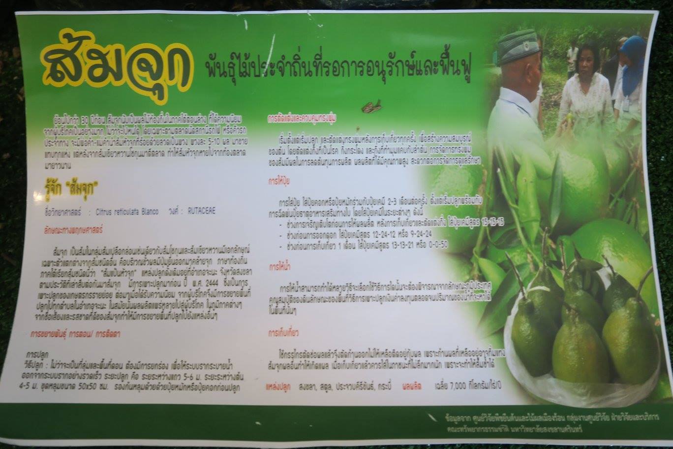 สองสามซุ้มน่าสนใจที่เต้ยไม่รู้จักมาก่อน ก็มี “นา ณ คอน ที่หัวไทร” ทำข้าวออกมาน่าซื้อกินมากเลยครับ โดยเฉพาะข้าวกล้องหอมกุหลาบแดงที่จะเอาไปหุงกินกับน้าพา กับมีซุ้มของ “มุสลิมีนจากร่อนพิบูลย์” คนหนึ่งเรียกเข้าไปให้ดูผ้าฮิญาบที่เอาเศษลูกไม้มาประดับทำได้สวยมากจนอดคิดถึงแม่ไม่ได้ ถึงซุ้ม “ลูกชกจากรัษฎา” ยิ่งนึกถึงแม่ใหญ่ แต่ว่าเขาขายหมดแล้ว เหลือแต่รูปภาพและของแสดงกับเบอร์โทรเท่านั้น ส่วน “ส้มจุกจะนะ” นั้น หมดปัญญาเอาต้นกลับไปปลูกทดแทนที่พ่อกับแม่เคยขุดร่องปลูกไว้ที่สวนยวนแหล รวมทั้งที่เต้ยก็เคยปลูกใหม่รอบหนึ่งแล้วตายหมด รอบนี้เขาว่ามีวิธีชี้แนะ แต่ว่าขนขึ้นเครื่องไม่ได้ เขากลัวดิน(-ระเบิด) ก็เลยขอปันผลเอาไปปอกกินกับน้าพาและน้องติ่งได้ ๒ ลูกเท่านั้นทั้ง ๆ ที่เขาให้โควต้าคนละลูกเท่านั้น โดยเต้ยบอกว่าถ้าไม่ให้ ก็จะไปบอกน้องอีกคนเวียนมาซื้อแทน เขาก็เลยยอมครับ