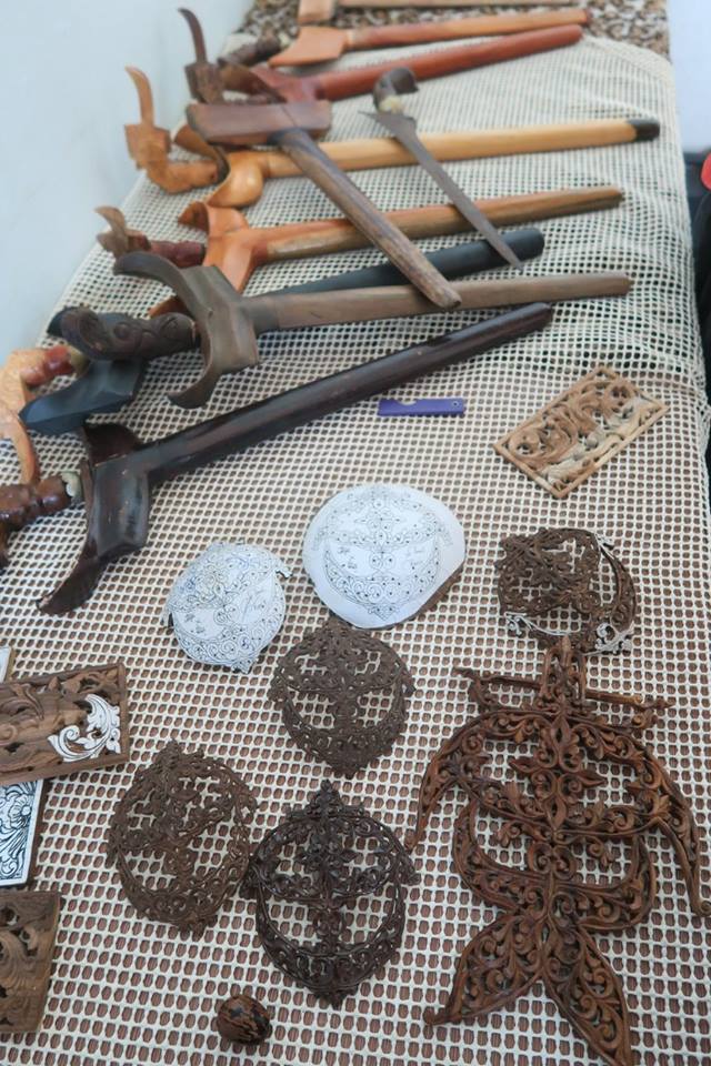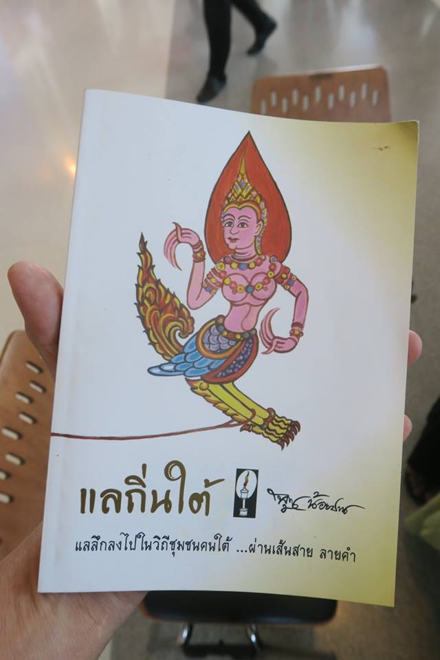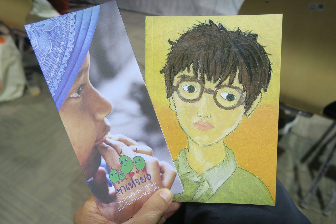 ท้ายสุดอีกสามกลุ่มของเยาวชนนั้น กลุ่ม “ระบัดใบจากระนอง” ที่รู้จักมานานและทำกันมาจนอายุ ๔๐ กว่าแล้วก็ยังขันแข็งเรื่องส่งเสริมการอ่านเพื่อสร้างสุขภาวะ ในขณะที่ “สมุดบันทึกมีชีวิตของกลุ่มลูกเหรียงจากยะลา” เอามาให้ซื้อหา บอกว่าหน้าปกเป็นภาพวาดของเด็ก ๆ ที่ได้รับผลกระทบจากความรุนแรงในพื้นที่ภาคใต้ เพื่อเอาไปพัฒนาชีวิตของเด็ก ๆ เหล่านั้น ยิ่งทำให้นึกถึงบ้านก๋งที่ยะลา – ท่าสาป – สะเตง เข้าไปใหญ่ สุดท้าย มีวัยรุ่นเฮ้ว ๆ กลุ่มหนึ่ง มาตั้งกอง “สลักกะลาจากยามู-ยะหริ่ง” กันคึกคักมาก เต้ยก็เลยอุดหนุนกะลาแกะรูปว่าววงเดือนมาอันหนึ่ง น้องเขาบอกว่าถ้าใส่กรอบ ๘๐๐ เปล่า ๆ ๔๐๐ แม่คงรู้นะครับว่าเต้ยเลือกเอาแบบไหนมา แม่เองก็แบบนั้นนั่นแหละครับ.