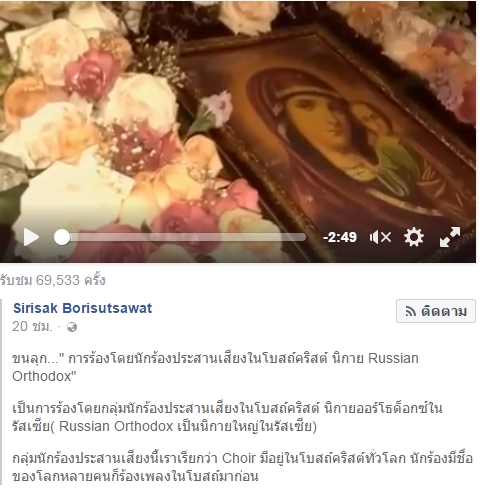 (พี่ติ่งทอรุ้ง torroong jarungkidanan ส่งผ่านของคุณ sirisak borisutsawat มาว่าขนลุก เป็นการร้องเพลงสรรเสริญพระบารมีในโบสถ์วิหารของนักบวชและศาสนิกแห่งคริสตศาสนาออร์โธด็อกซ์ในรัสเซีย ซึ่งผมถือว่านี่คือประจักษ์แห่งการดำรงพระองค์เป็นเอกอัครศาสนูปถัมป์ภกที่ทรงงดงามเป็นที่ประจักษ์ควบกับการทรงเป็นพุทธศาสนิกที่หมดจดอย่างยิ่ง แบบที่ยากจะหาประเทศไหน และพระราชาไหนได้บำเพ็ญมา)