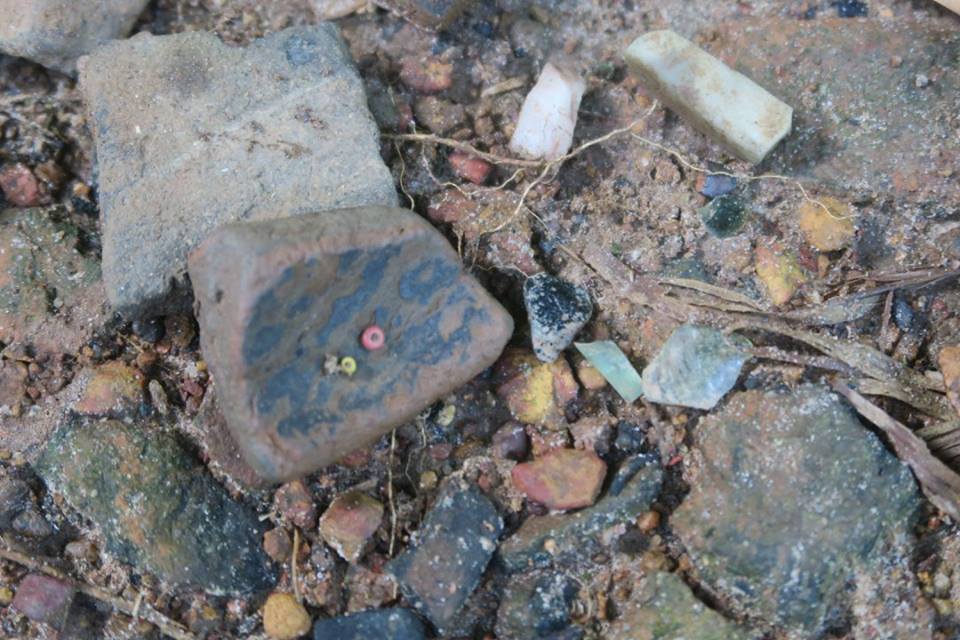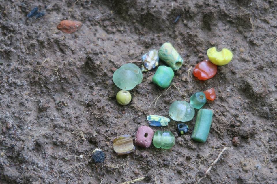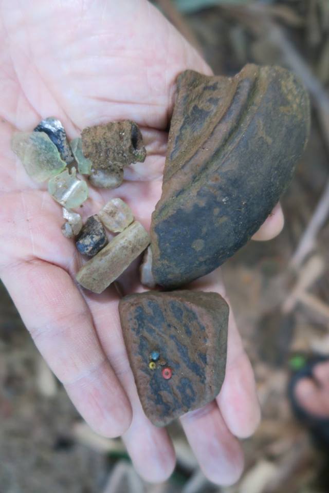 เท่าที่เห็น เป็นตลิ่งสูงสัก ๔ - ๕ เมตรจากชายน้ำคลองนางย่อนฝั่งใต้ มีสภาพเป็นป่าไผ่กับกระถินเทพาที่ผ่านการถางมาก่อนแล้ว มีกอต้นเข้าพรรษาติดผลค้างอยู่บนดินที่พรุนไปด้วยหลุมขุดค้นหาลูกปัด ก้ม ๆ เงย ๆ กันพักเดียวก็ไปลูกปัดลมมา ๓ เม็ด กับเศษแก้วและกระเบื้องจำนวนหนึ่ง เทียบกับเศษอื่น ๆ ที่เอ็มเก็บไว้ได้และเอาไปให้ได้ดูเป็นตัวอย่างด้วย