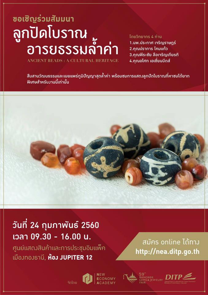เมื่อวันก่อน เชน ชุมพร แห่งเพจลูกปัดโบราณ บอกผมว่างานบางกอกเจมส์ปีนี้ กรมส่งเสริมฯ เชิญให้ไปช่วยจัดแสดงและบรรยายเรื่องลูกปัด และขอให้ผมไปด้วยโดยผมก็ตอบรับทันทีหลังจากตรวจตะรางชีวิตแล้วว่าว่าง เพราะนี้เป็นอีกจังหวะในเชิงยุทธศาสตร์การขับเคลื่อนพัฒนาและยกระดับวงการลูกปัดที่สำคัญมาก หากสามารถนำเรื่องลูกปัดที่ไทยเรารุ่งเรืองมากมานานหลายพันปีในฐานะอัญมณีดึกดำบรรพ์มาเชื่อมกับวงการเครื่องประดับและอัญมณีไทยและโลกปัจจุบันที่มีมูลค่ามหาศาล ไม่ว่าจะเพียงเรื่องราว หรือกระทั่งการนำมาดีไซน์ ตลอดจนการผลิตใหม่ให้ประกอบด้วยเรื่องเก่า ดังที่ตอนนี้ก็กำลังเตรียมการเรื่องพิพิธภัณฑ์เครื่องประดับโบราณอยู่ด้วย
