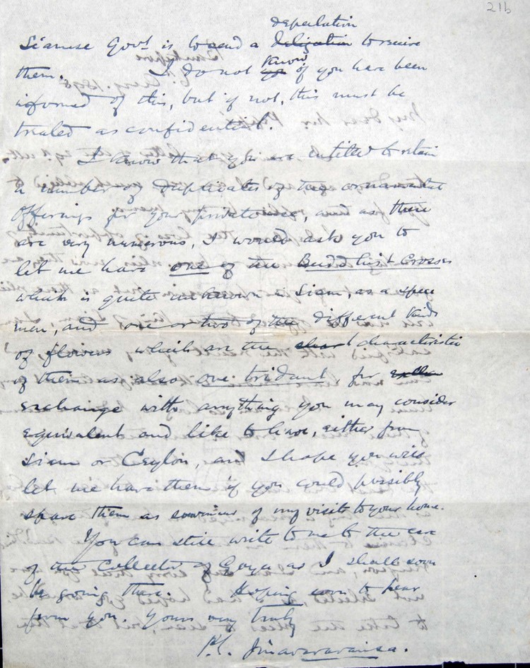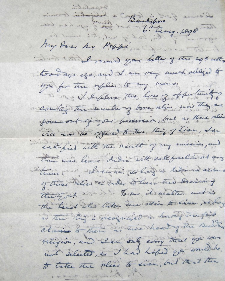 ในจดหมายฉบับดังกล่าว พระภิกษุพระองค์เจ้าปฤษฎางค์ได้มีไปถึงเป๊ปเป้ว่า “ ... ทราบว่ารัฐบาลอังกฤษอนุญาตให้เป๊ปเป้เลือกของที่ซ้ำเก็บไว้ได้ส่วนหนึ่ง ซึ่งก็เป็นจำนวนมาก จึงขอ #สวัสดิกะ (buddhist cross) ที่ในสยามไม่รู้จักกัน กับ #ดอกไม้ ๑ - ๒ ดอกที่แบบแตกต่างกัน รวมทั้ง #ตรี (ในจดหมายเรียกว่า trident ซึ่งน่าจะคือตรีรัตนะ) ซึ่งล้วนเป็นสิ่งที่มีความจำเพาะในการพบนี้ แลกเปลี่ยนกับอะไรก็ได้ในสยามหรือศรีลังกาที่เป๊ปเป้เห็นว่าเหมาะสม ทั้งนี้เพื่อเป็นที่ระลึกการได้ไปเยี่ยมถึงบ้านของเป๊ปเป้ ... ” แล้วต่อมาในวันที่ ๓ กันยายน พ.ศ.๒๔๔๑ ท่านได้ส่งจดหมายอีกฉบับจากพุทธคยาถึงเป๊ปเป้ ระบุว่าได้จัดส่งอัลบั้มดวงตราไปรษณียากรสยามครบชุดพร้อมตัวอย่างที่หาได้ยากแม้ในขณะนั้น โดยไม่มีข้อความว่าได้รับอะไรจากเป๊ปเป้หรือไม่
